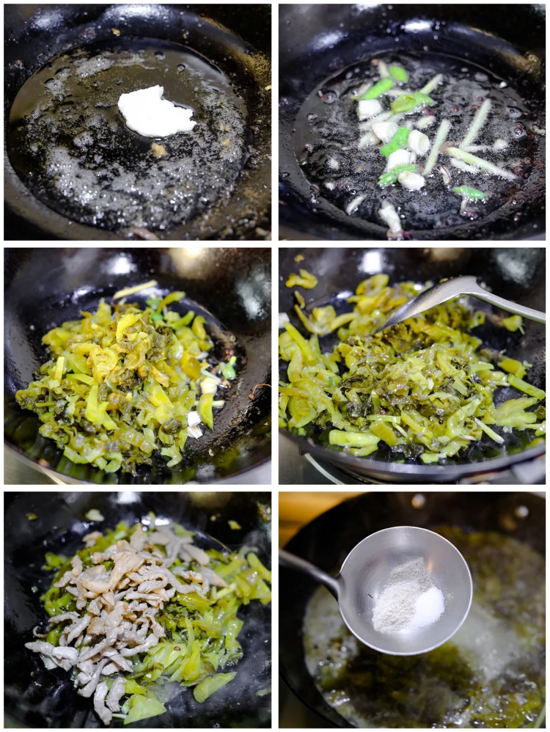4.锅中加入葱油,放一点猪油,口感酸菜的口感更加绵软。待猪油融化之后,加入葱姜和几个花椒粒,炒出香味之后,加入酸菜翻炒,大约一分钟之后加入炒过的猪肉丝,翻炒均匀,让味道充分融合。