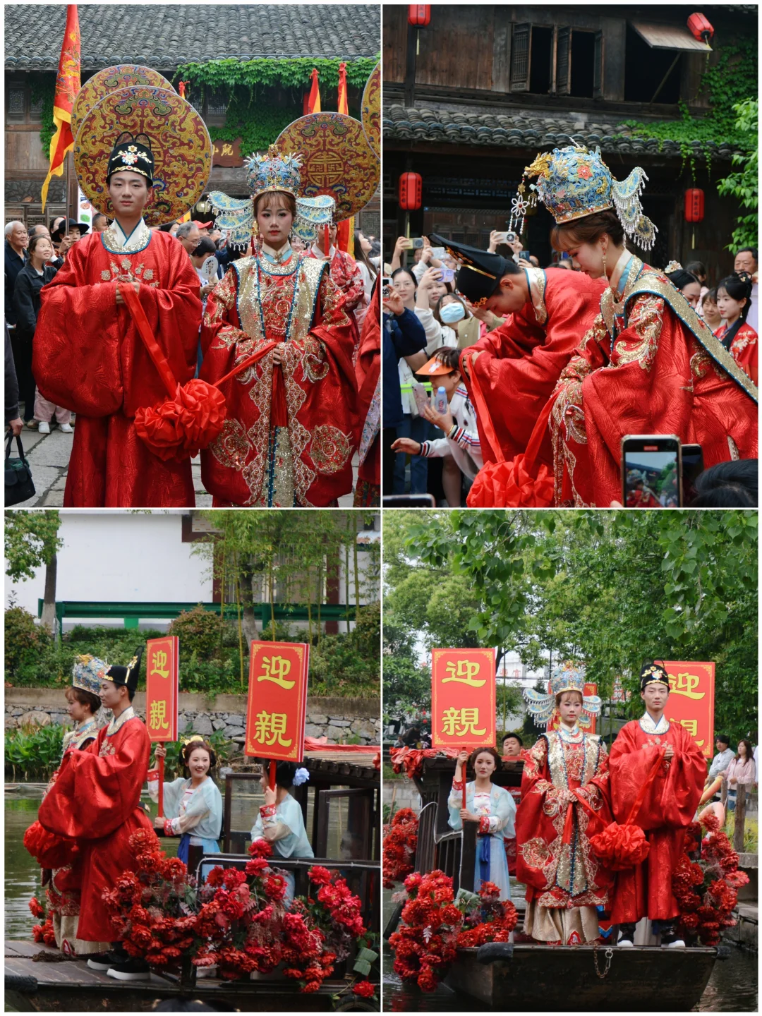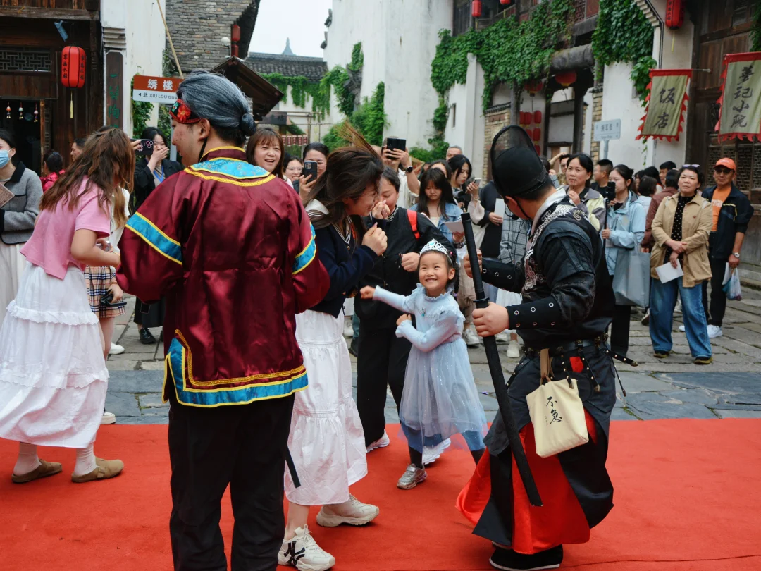 观看花美男锦衣卫、状元巡街、抛绣球、水上婚礼、花船巡游表演,乘船游览水镇。好有意思,水上婚礼真的绝了,以前只在电视剧中看过。