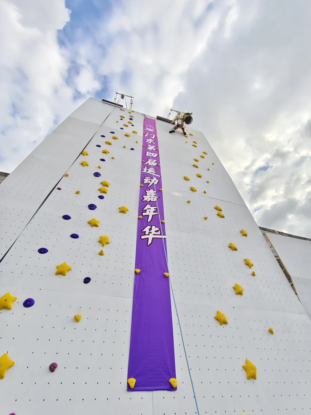 正面中间岩壁用于比赛和游客体验,两侧小岩壁区用于定邀攀岩爱好者体验、展示,