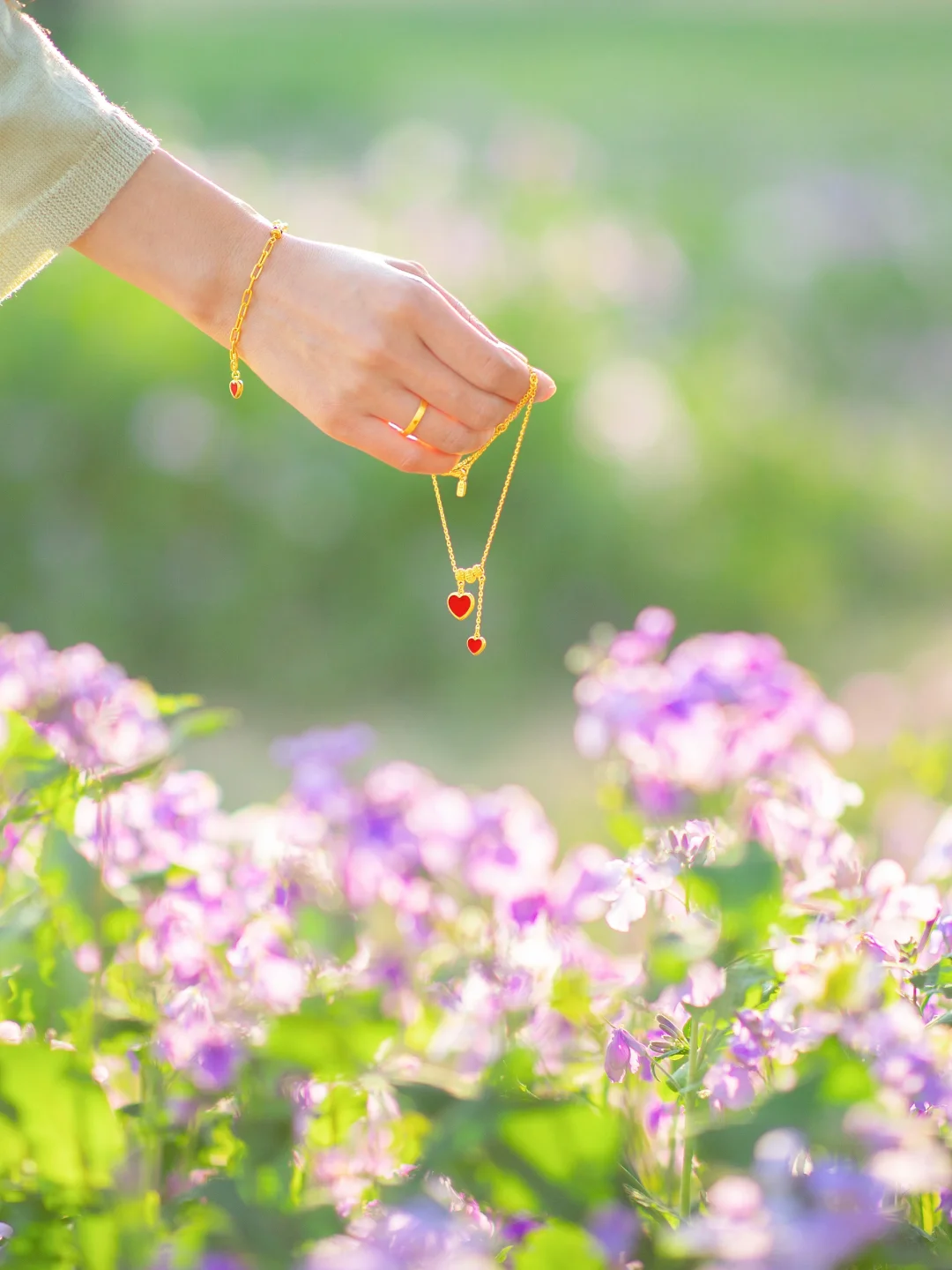 [四R]、带些增加氛围感的道具,帽子、书本、食物等,拍照时手不会空空的尴尬。今天分享一套六福珠宝的黄金首饰,在阳光下bling bling闪着光✨,搭配少女感红色珐琅爱心吊坠❤️,增添了许多精致的氛围感~