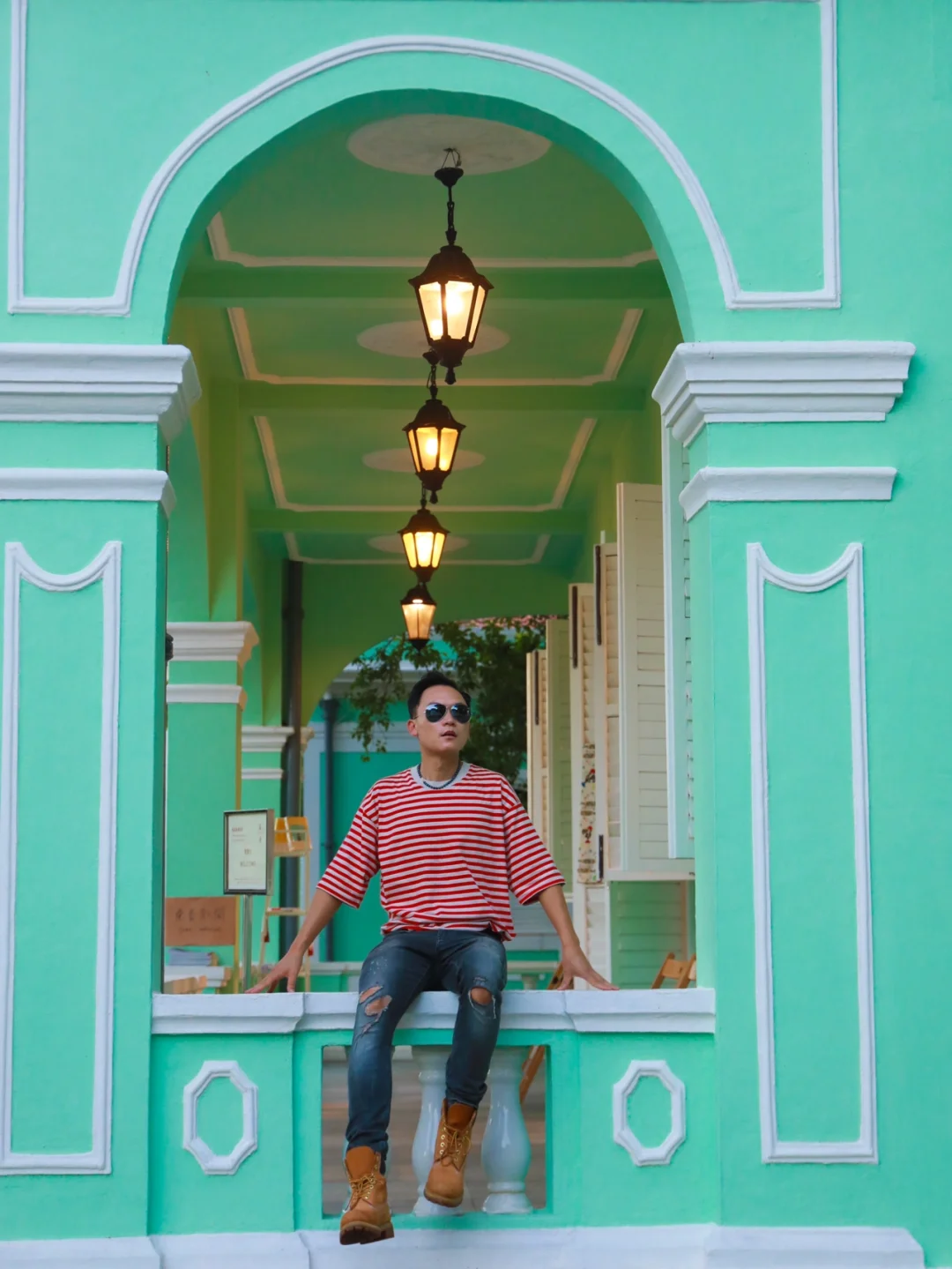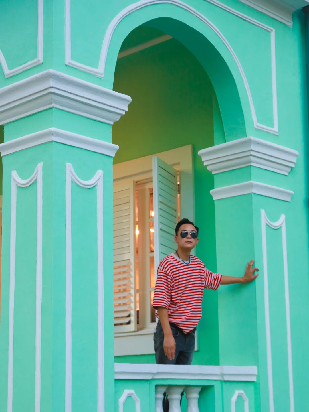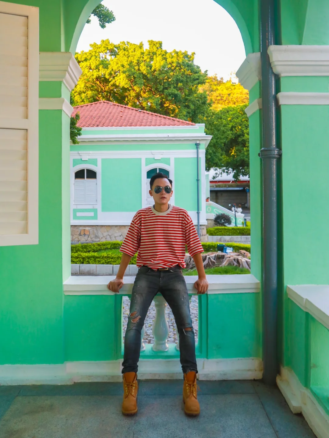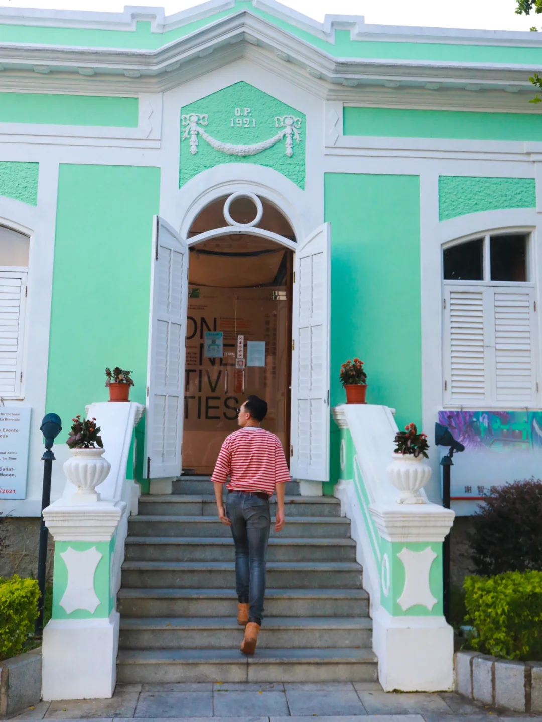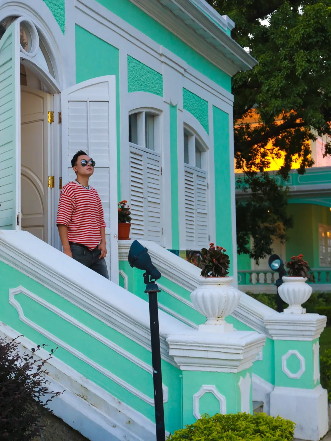 太喜欢这种薄荷绿 可以拍出大片的感觉 ❤️❤️❤️ 建议穿亮色系,色差感强烈的衣服 最好是穿小礼服或者有些设计的衣服 一定会很出片! 🌟🌟🌟划重点🌟🌟🌟 这里是澳门凼仔的【龙环葡韵住宅博物馆】 门票:0元门票 不用预约 建议游玩时间:1小时 🌟🌟 澳门威尼斯人或者澳门银河可以走路过去 (走路大约20分钟) 就在官也街旁边 ❤️❤️❤️【路线怎么走】❤️❤️❤️ 1⃣️从威尼斯人出发 🌟走到威尼斯人西门上穿梭大巴这个门🚶🚶然后走到外面的大马路边,接着转右走🚶大概10米,有个人行天桥,然后走上天桥,穿过天桥,然后有一条很长的直路,没错,看到这个直路就对了,这条路上有人行电梯,大胆放心坐人行电梯,太爽了,坐完全部人行电梯(好像有三段),这里有指示路牌🪧,左边👈是去官也街,右边👉是去龙环葡韵住宅博物馆,往右揍大概200米就可以看到这些好看的薄荷绿建筑。📷 2⃣️从澳门银河度假区出发 从银河酒店正门出来,🚶🚶走到人行天桥穿过轻轨排角站,🚶🚶往官也街的方向走,然后走到天后宫那里,对面有一懂也是薄荷绿的建筑,叫做路凼历史馆(这也很好拍照)然后沿着这条直路一直走(两边有一些卖吃的和喝的店铺),一直走,走到官也街与施督宪正街交界的T字路口,右手边是【老虎堂黑糖专卖店】,左手边是【旺记咖啡】,你会看见右边有楼梯,沿着楼梯走上去,一直靠着右手边走,再经过一个小型教堂,沿着小坡走下去,再往前30米,就是一个公园,继续往公园走200米左右,就到龙环葡韵住宅博物馆了。📷 ❤️龙环葡韵可以跟官也街的路线穿起来一起玩。 另外,附近不远处就是【大潭山】,有免费电梯坐上去,不用登山。在观景平台可以看到威尼斯人和银河的全景,可以一起去游玩】 ❤️线路设计 1⃣️澳门银河度假区🚶路凼历史馆📷🚶官也街(拍照、品美食)🚶龙环葡韵住宅博物馆📷🚶大潭山📷 2⃣️澳门威尼斯人🚶龙环葡韵住宅博物馆📷🚶大潭山📷🚶官也街(品美食、拍照)🚶路凼历史馆📷 🌟🌟澳门一个舒服而又有特色的城市,值得好好看看。