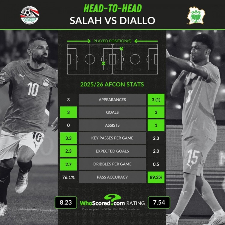 直播吧1月11日讯埃及和科特迪瓦在非洲杯八强战狭路相逢,whoscored也对比了两队明星球员本届赛事的关键数据: