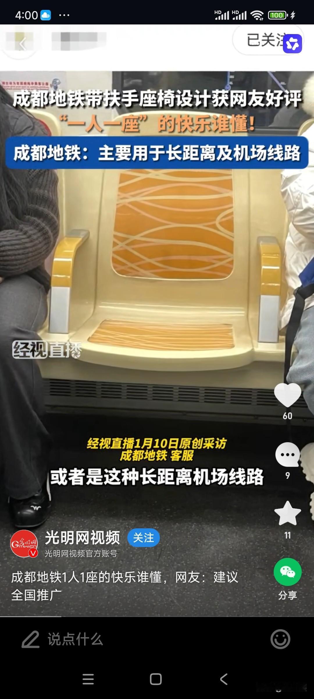 成都地铁“1人1座”火了!网友:建议全国抄作业 成都地铁新装的“带扶手座椅”火了!这种座椅在每个座位间加装弧形扶手,明确划分个人空间,有效杜绝“一人占多座”“劈叉坐”等不文明现象,被网友称为“社恐福音”“座位界清流”,直呼“建议全国推广”。 成都地铁回应称,目前主要在客流量较小的18、19号线试点,新线将根据客流“定制”座椅,但老线因空间和大客流限制暂难改造。你支持这种座椅设计吗? ^0^信息来源:中华网、搜狐新闻