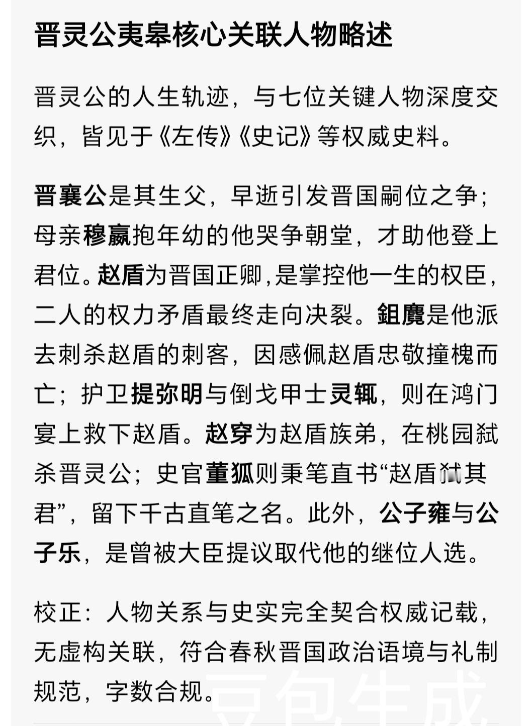 被历史简化的暴君 晋灵公夷皋(yí gāo)的悲剧人生 提到晋灵公夷皋(yí gāo),多数人想到的是《左传》里那个荒唐君主:从高台上弹人,看行人躲避弹丸取乐;因一碗熊掌没炖烂,就杀掉厨师,还让宫女用畚(běn)箕抬着尸体走过朝堂。史书寥寥几笔,便将他钉在了暴君的耻辱柱上。但剥开历史的标签,这位惨死在权臣手中的年轻君主,一生都困在权力博弈的漩涡里。 公元前621年,晋襄公去世,年仅四五岁的夷皋(yí gāo)被母亲穆嬴抱上了政治舞台。彼时的晋国,虽还留着晋文公称霸的余威,可卿大夫家族的势力早已悄然膨胀,赵氏、狐氏、先氏等大族把持朝政,国君的权力不断被侵蚀。 围绕国君之位,朝堂掀起了一场立嗣风波。正卿赵盾主张拥立年长贤能的公子雍,公子雍当时流亡秦国,有治国之才;大臣狐射姑则主张拥立公子乐,公子乐寄居在陈国。双方争执不下之际,穆嬴抱着幼子,每天到朝堂哭诉:“先君何罪?其嗣亦何罪?”她的激烈抗争,加上部分大臣的支持,最终让年幼的夷皋(yí gāo)得以继位,是为晋灵公。赵盾随后派人前往秦国迎回公子雍,又半路截杀,彻底断绝了其他继位的可能。这场风波,早已预示了夷皋(yí gāo)的悲剧命运——他从一开始,就是各方势力妥协的产物,更是权臣掌控的傀儡。 继位之后,晋灵公的童年和少年时代,完全活在赵盾的阴影之下。史书记载“赵盾为政,灵公初立,年幼,政皆决于盾”,短短一句话,道尽了君主的无奈。国家的征兵、赋税、赏罚、外交等大权,全由赵氏家族主导;朝堂上遍布赵盾的门生故吏,军队里的要职也被赵氏亲信掌控。十几岁的晋灵公坐在朝堂高位上,看着大臣们围绕赵盾商议国事,自己却连插嘴的余地都没有。长期的压抑与屈辱,逐渐扭曲了这个少年君主的性格。 等到晋灵公长到十五六岁,渴望亲政的念头越来越强烈,可赵盾丝毫没有还政的打算,君臣之间的矛盾彻底公开化。史书中记载的几件荒唐事,都发生在这个阶段:他加重百姓赋税,只为装饰宫墙,试图用这种方式建立自己的权威;他在高台上用弹弓射向过往行人,看着人们惊慌躲避的样子,以此宣泄内心的愤懑;他因厨师炖不熟熊掌就痛下杀手,漠视生命的背后,是对权力失控的极度焦虑。 走投无路的晋灵公,选择了最极端的反抗方式——刺杀赵盾。 第一次,他派刺客鉏麑(chú ní)潜入赵盾家中。鉏麑(chú ní)凌晨抵达时,看到赵盾早已穿戴整齐,端坐在堂上等待上朝,只因天色尚早而假寐。鉏麑(chú ní)感慨:“不忘恭敬,民之主也。贼民之主,不忠;弃君之命,不信。”两难之下,他一头撞在槐树上自尽而亡。 第二次,晋灵公设下鸿门宴,宴请赵盾,暗中埋伏甲士,打算在席间除掉他。赵盾的护卫提弥明察觉了杀机,赶紧扶着赵盾退下朝堂。晋灵公见状,放出猛犬扑咬赵盾,提弥明拼死击杀猛犬,掩护赵盾离开,自己却被甲士杀死。危急时刻,曾受过赵盾一饭之恩的甲士灵辄(líng zhé)倒戈相救,赵盾才得以脱险。 两次刺杀失败后,赵盾被迫逃亡,却始终没有离开晋国国境。不久后,赵盾的族弟赵穿,在桃园之中弑杀了晋灵公。此时的晋灵公,不过十八九岁。 赵盾随后返回国都,重新执掌朝政。晋国史官董狐在史册上写下“赵盾弑其君”五个字。赵盾辩解自己并未动手,董狐反驳:“子为正卿,亡不越境,反不讨贼,非子而谁?”这便是历史上著名的“董狐直笔”。 晋灵公的一生,是春秋时期卿权崛起、君权衰落的缩影。他幼年丧父,在权臣的掌控下长大,从未接受过系统的为君教育。他渴望挣脱束缚,却只能用残暴荒唐的方式宣泄怒火;他试图夺回权力,却既没有自己的政治班底,也得不到其他卿族的支持,最终只能以孤注一掷的暗杀,走向毁灭的结局。 他的恶名,是个人的选择,更是时代的病灶。那个礼崩乐坏的春秋乱世,碾碎了一个少年君主的所有挣扎。 读晋灵公的故事,总让人唏嘘不已。你觉得,晋灵公的悲剧,更多是个人性格所致,还是时代环境的必然?东周列国志 晋襄公之子 晋灵公