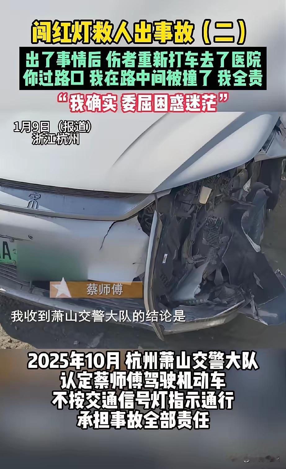 根据你提供的案件情节,以及相关法律法规,以下是对蔡师傅行为的法律分析和评价: 一、基本事实回顾 蔡师傅为救助伤者,按照交警的“示意”跟随摩托车前行,途中不慎闯红灯而发生碰撞,责任最终被认定为他闯红灯全责。 事件中交警骑摩托车在前带路,但“示意”行为是否具备正式法律意义,是争议焦点。 蔡师傅的经济损失巨大,包括车辆维修费、车辆停运造成的收入损失和保险费用增加。 事件系因救人心切,蔡师傅对结果深感委屈。 二、法律分析 关于“跟随交警摩托车是否构成“现场指挥” 根据《道路交通安全法》第38条规定:“遇有交通警察现场指挥时,应当按照交通警察的指挥通行。” 现场指挥的要素:需有明确的指挥行为,比如手势、口令、信号灯指示等,形成具有法律效力的交通指示。 在本案中,交警骑摩托车“用下巴示意”蔡师傅跟上,这属于非正式、非明确的指示,不应被认定为正式的交通指挥。 因此,蔡师傅不能以“跟随交警指挥”免责,必须遵守交通信号灯的指示。 关于闯红灯的责任 根据交通法规,车辆应当遵守交通信号灯通行,除非在交通警察现场指挥下且有明确指示。 蔡师傅未能确认交警的示意是否为正式指挥,也未观察到信号灯状态。而在路口红灯时跟随摩托车前行,违反了交通信号灯的要求。 因此,交警认定他闯红灯,具有法律依据。 关于交警的优先权和“示意”行为的法律效力 警车在执行紧急任务时具有优先权,但此权利仅限于交警执勤车辆本身,跟随车辆(如蔡师傅)没有自动享有特权。 交警的“示意”并非正式执法行为,不能作为免除责任的依据。 救助行为的法律保护 根据《中华人民共和国刑法》《道路交通安全法》等,善意、紧急的救助行为一般可以获得适当的法律保护,减少责任或免予处罚。 但责任认定主要取决于道路交通法规的遵守情况。 三、结论建议 蔡师傅在紧急救助时,尽管动机善良,但在法律上仍需遵守交通信号和交通法规。 交通责任认定符合现行法律规定,闯红灯行为由主动跟随非正式指示导致,应承担全部责任。 救助行为可以作为善意的理由,向有关部门申请行政复议或处罚缓解,但不能改变闯红灯的责任认定。 四、建议 申诉途径:蔡师傅可在法律允许范围内提出复议,强调自己当时处于紧急救援状态,争取减轻或撤销责任。 赔偿协商:可以与受损车辆车主协商经济补偿事宜。 未来注意事项:在紧急情况下,应尽量观察交通状况,确保安全后再采取行动,减少交通违法风险。 总结:在法律上,蔡师傅的行为存在违反交通信号灯的风险,但他的善意和紧急救援的动机值得尊重。建议以法律途径合理申诉,同时在今后行动中更加注意交通安全。娶妻重要的是贤惠还是美貌 对爱的人付出应该要求回报吗?