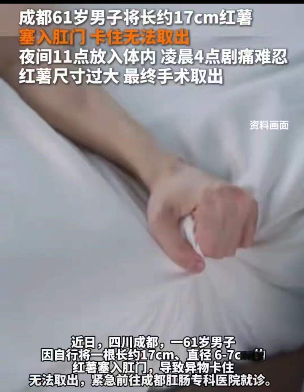 四川成都,一位61岁的大爷深夜干了件让人哭笑不得又心疼的事——他把一整根红薯塞进了肛门,结果卡住拔不出来,凌晨4点疼得满头大汗,只能红着脸跑去医院求救。 这件事乍听之下实在令人咋舌,但细细想来,却折射出许多我们平凡生活中的无奈与无助。大爷或许只是出于好奇,或是被某些“奇思妙想”冲昏了头脑,没想到一个天真的“尝试”会变成一场生死攸关的紧急救援。这样的故事,似乎离我们很远,却又如此贴近生活的某个角落。 你是否也曾在某个瞬间,被自己的冲动或无知所困扰?或许,只是一时的好奇心,便能让人陷入无法自拔的尴尬境地。更何况,老年人常常因为孤独、寂寞,在精神上承受着比我们想象中更大的压力。这个大爷,只不过是用一种极端的方式,试图寻求一点点“刺激”或“快乐”,却没想到会酿成如此荒诞的后果。 这件事引发了网络热议,有人调侃“这是红薯的逆袭”,有人感叹“老人真是太无聊了”,也有人在评论区留言:“生活再平淡,也别拿健康开玩笑。”无论笑话还是叹息,都折射出我们对老年人群体的关心与担忧。毕竟,面对孤独与无聊,很多人会选择一些极端的方式来寻求“存在感”或“慰藉”。 但更深的层次,是我们对“健康意识”的呼唤。生活中,类似的“奇怪”行为其实反映出一种潜在的危险:对身体的忽视、缺乏科学的健康知识,甚至是心理上的孤独感。我们是不是也该反思一下?在追求“新奇”与“刺激”的同时,是否忽视了对自己身体的尊重和保护? 这个故事告诉我们:生命脆弱,健康无价。每个人都值得被关心、被爱护,而不是用极端的方式来寻求关注。老人们的无助,我们不能视而不见;年轻人的冲动,也需要更多的理性引导。让我们用更多的关心和理解,去温暖那些孤独的灵魂。 或许,这个大爷的“奇葩”行为会成为一面镜子,提醒我们每个人都要珍惜健康,理性面对生活的各种诱惑。毕竟,生命只有一次,别让冲动成为最后的遗憾。希望他早日康复,也希望我们每个人都能从中学到一点:爱自己,爱生命,才是最值得珍惜的“红薯”。大爷的困难生活 老人电梯内大便