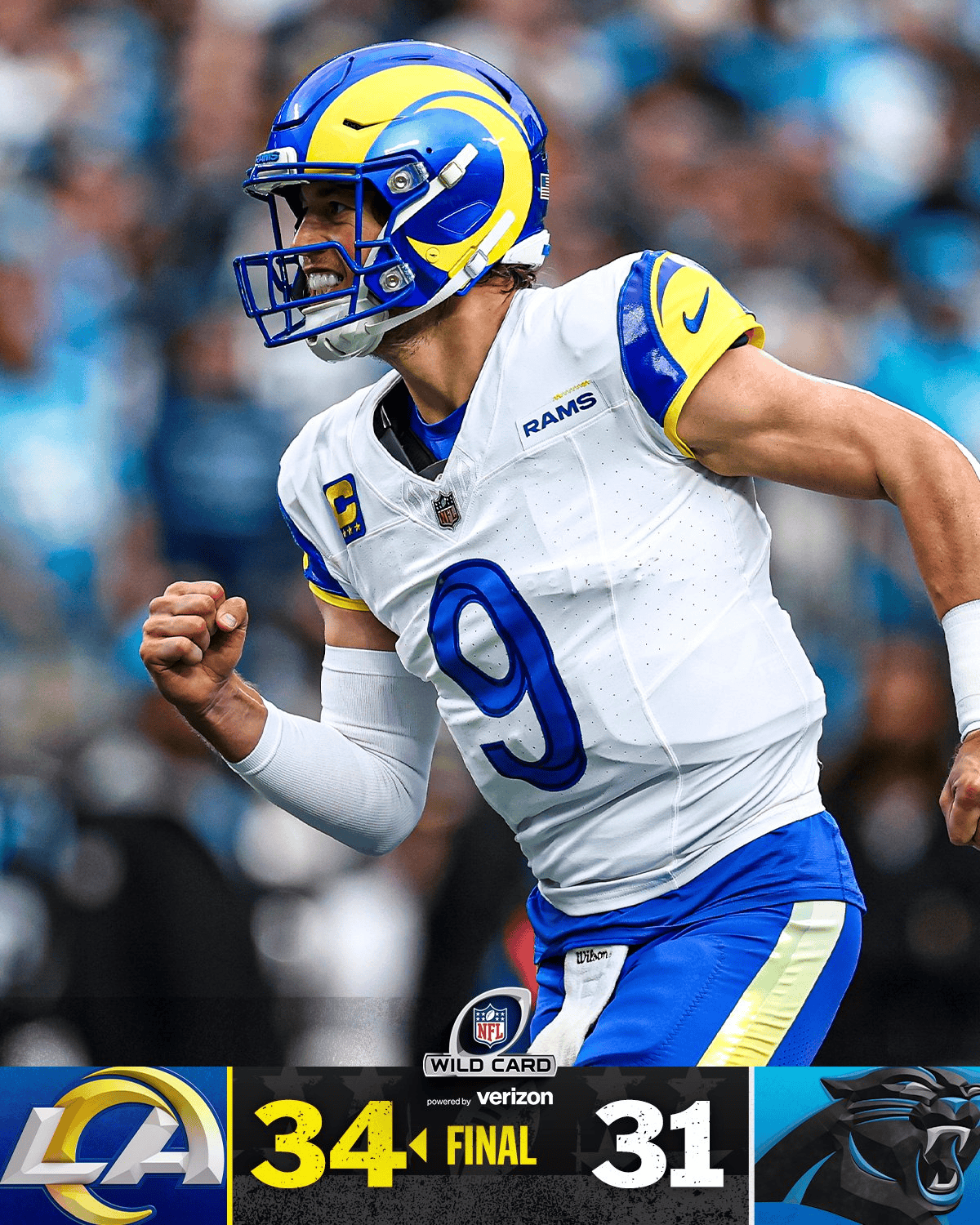 虎扑01月11日讯刚刚结束的NFL国联外卡轮一场比赛,洛杉矶公羊在客场34-31战胜北卡罗莱纳黑豹,成功进入分区轮。