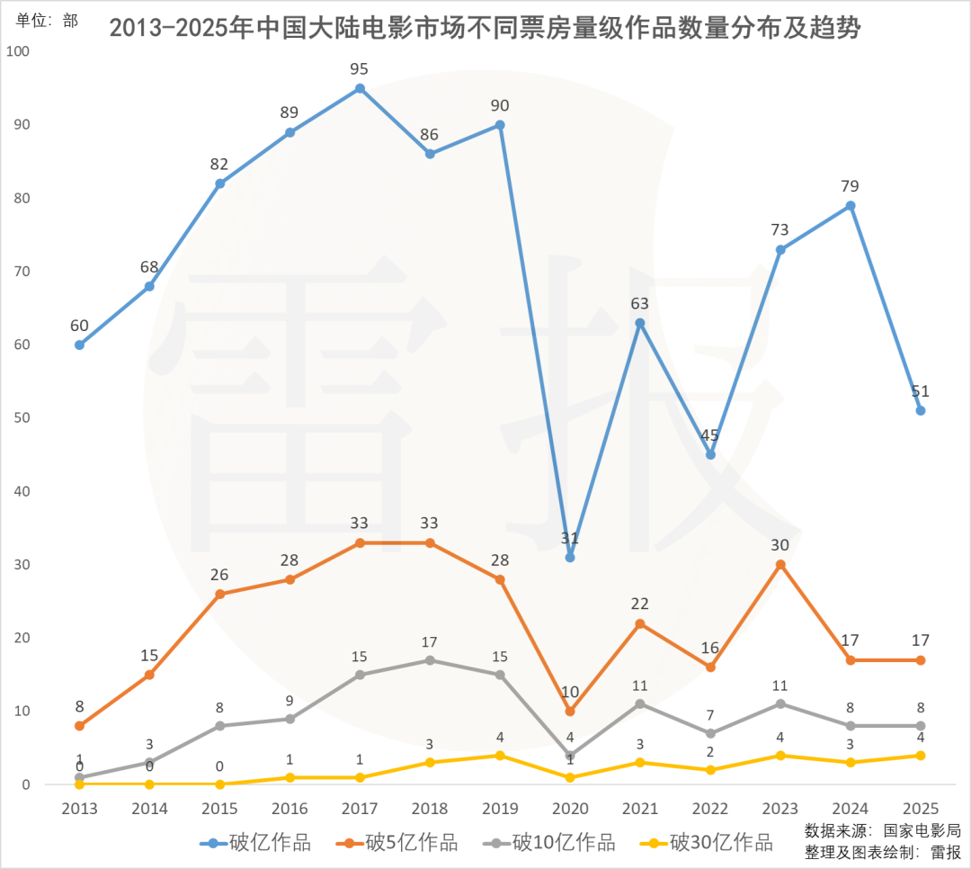 这一年,票房30亿+作品仍有4部之多,且4部累计票房超260亿元,占全年票房的一半以上。但票房过亿作品仅51部,过5亿作品仅17部,都远不如10年前的2016年,腰部影片断层的现象日趋加剧。