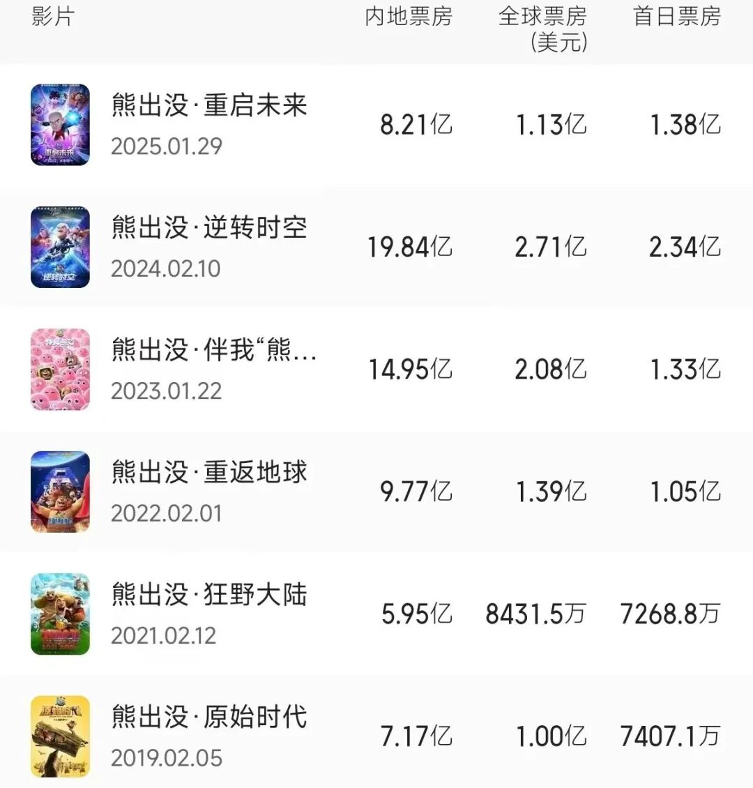 例如,作为春节档的“名作之壁”,《熊出没·重启未来》的亲子家庭观众被《哪吒2》显著分流,致使票房大幅缩水,对比2024年《熊出没·逆转时空》19.84亿元的票房佳绩,2025年的该片仅获8.21亿元。