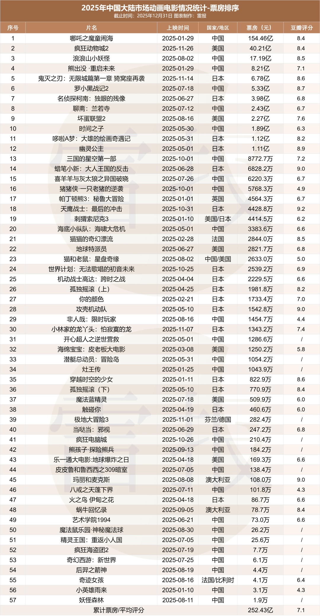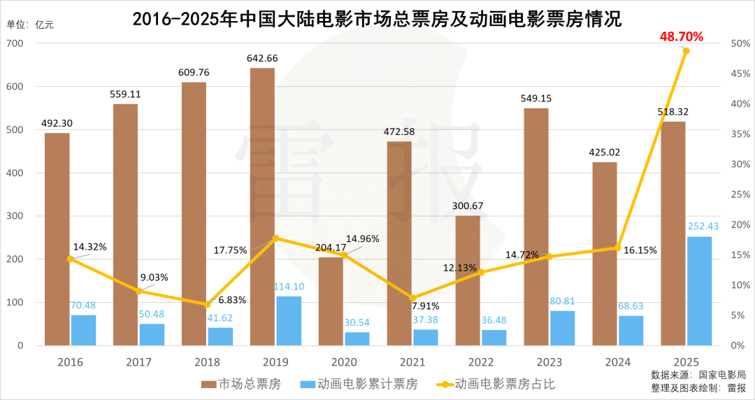 这其中,雷报长期关注的动画电影品类的表现最为亮眼,全年累计票房达到252.43亿元,同比大增268%,市场占比从往年的5%-20%飙升至近50%,成为拉动市场增长的核心动力。