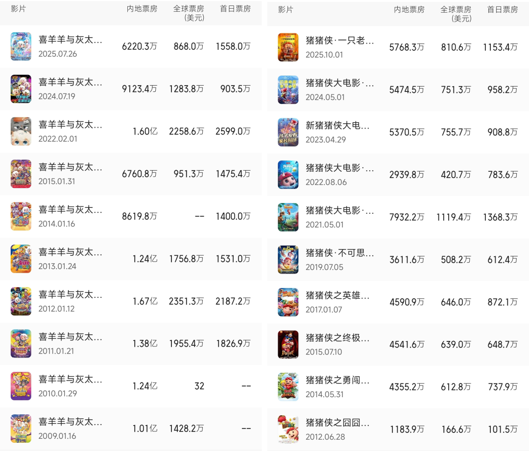 国产儿童动画三巨头中的“喜羊羊”和“猪猪侠”也表现平平。前者新作《喜羊羊与灰太狼之异国破晓》票房6220.3万元,创下全系列10部动画电影的新低;后者则在今年上映了20周年大电影《猪猪侠·一只老猪的逆袭》,且十分“听劝”地采用了初代猪猪侠的形象,却依旧因剧情短板未能达到预期,5768.3万元的票房在系列10部作品中排名第二,但也只能算是中规中矩。