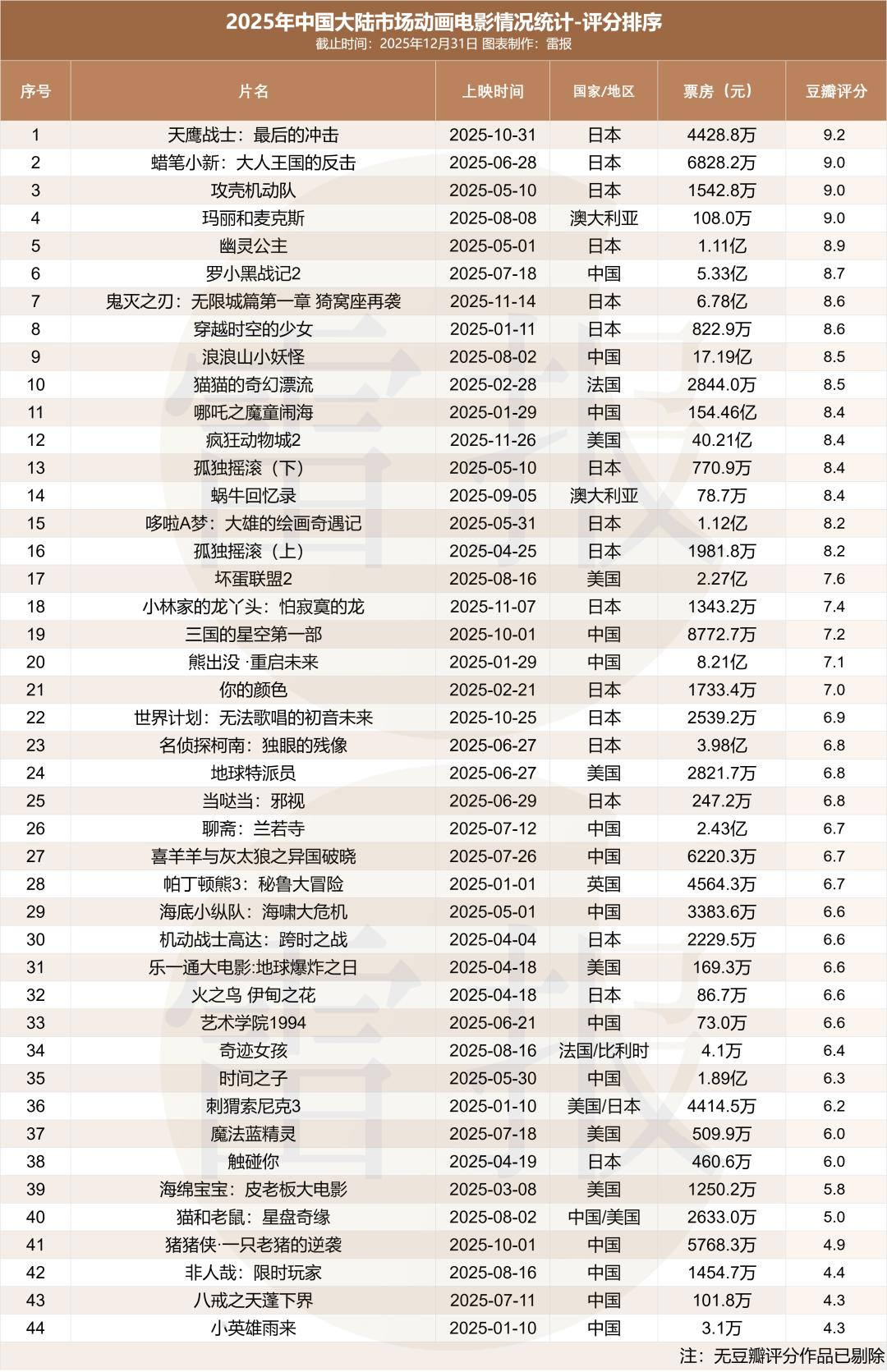 值得注意的是,评分前五的作品均为“老片新映”的经典之作。若剔除这一类别,仅统计近两年上映的新片,评分前五则依次为:《罗小黑战记2》8.7分、《鬼灭之刃:无限城篇第一章猗窝座再袭》8.6分、《浪浪山小妖怪》8.5分、《猫猫的奇幻漂流》8.5分、《哪吒之魔童闹海》8.4分,三部热映国产动画全部上榜。