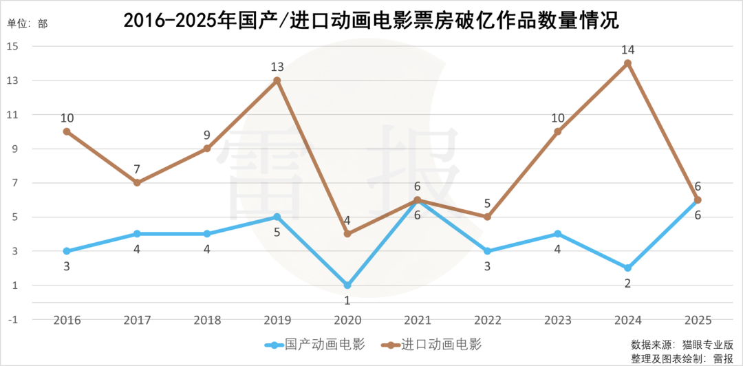 不过从国产/进口动画电影的对比来看,今年破亿作品数量的减少主要是进口动画表现不佳导致,国产6部破亿作品已经是历史最好水平。但考虑到这十年是国产动画电影的快速崛起期,破亿作品数量始终未能突破6部的瓶颈,也暴露出行业的“头部依赖”困局。动画电影行业仿佛一直是“小圈子的游戏”,票房的增长高度绑定光线传媒、追光动画、华强方特等头部企业的产能与内容输出节奏,腰部创作力量严重不足,这也是为什么“大小年”现象如此突出。