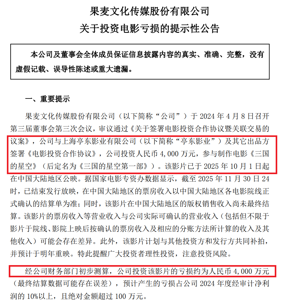猫眼出品的《时间之子》倒是超出预期,作为奇幻爱情类动画,其在王俊凯、周深等一众明星势能的加持下,斩获1.89亿元票房。相比之下,同样有名人效应的加持,《三国的星空第一部》的表现则不尽人意。该片手握三国大IP、易中天编剧、檀健次配音的豪华配置,上映前便收获多圈层关注,最终却因制作质感粗糙、历史改编脱离大众认知、受众定位模糊等硬伤票房遇冷,仅获8772.1万元票房。出品方果麦文化公告显示,其对该片的4000万元投资额全数亏损,并计划补拍重映。