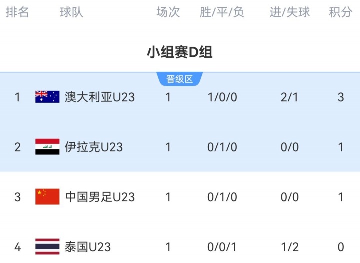 首战U23国足0-0战平伊拉克U23,而澳大利亚U23则2-1击败泰国U23,暂时占据本组第一的位置。