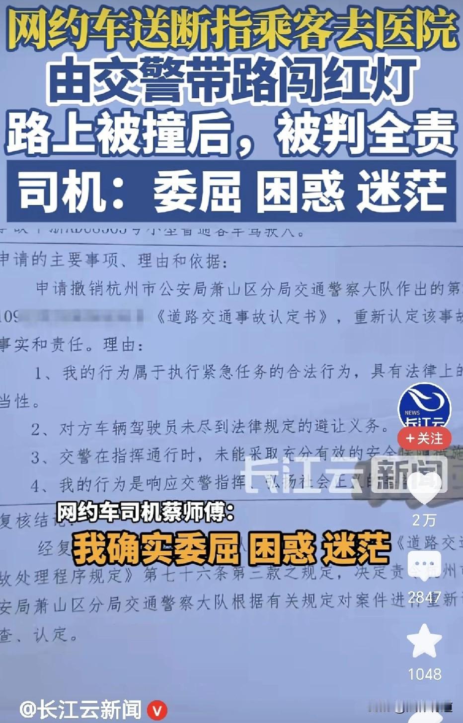 网约车司机闯红灯救断指乘客却判全责:善意与法规的碰撞,该如何破局? 2025年9月,杭州萧山街头,网约车司机蔡师傅的车内气氛焦灼到凝固——后座乘客的左手被机器切断,断指裹在渗血的塑料袋里。 家属攥着伤口的纸巾已被染红,反复催促“再快一点,医生说黄金时间就几小时”。 为抢这关乎“手指能否接回”的时间,蔡师傅在路口求助执勤交警,跟着警摩闯红灯,却与绿灯正常通行的私家车猛烈相撞。 气囊弹出的瞬间,他以为“救人要紧,有交警带路肯定没事”,可三个月后,“全责”认定书、4万余元修车费、40天停运损失,以及即将上涨的保费,让这位好心司机陷入了“行善反亏”的绝境。 据他回忆,事发当天接单后,得知乘客需紧急进行断指再植手术,他立即偏离常规路线往最近的三甲医院赶。 行驶1公里后,家属发现路边有交警执勤,当即下车求助。交警查看伤者伤情后,先拍下蔡师傅的车牌,再骑上警摩拉响警灯,回头用“下巴示意”他跟上——这个看似明确的“指引”,成了蔡师傅后续判断的核心依据。 “我满脑子都是‘别耽误手术’,警摩走在前面,我就跟着过了红灯。”蔡师傅说,直到与横向车道的白色私家车相撞,他才反应过来“忘了观察路况”。 事故造成两车前脸严重损毁,白色轿车上两名乘客轻微擦伤,幸运的是断指乘客未延误治疗,自行换乘车辆前往医院。 但蔡师傅的麻烦才刚刚开始:2025年10月,萧山交警大队依据《道路交通安全法》第三十八条,认定他“驾驶机动车不按交通信号灯指示通行”,负事故全部责任;2026年1月,他申请复核后,上级部门以“事实不清”要求重查,可最终结论依旧——全责。 @法律有道 事件曝光后,网友的争论瞬间发酵:支持蔡师傅的人认为“不能让好心人寒心,特殊情况该特殊对待”;反对者则指出“交通规则是生命红线,违规救人可能引发更多伤害”;还有人聚焦交警的“下巴示意”——“这算不算正式指挥?既然带路了,为何不疏导其他车辆?” 从法律角度看:全责认定为何“合法却难服众”? 交警判定蔡师傅全责并非“机械执法”,但“善意动机”与“法律后果”的割裂,正是争议的核心。我们可从三个关键法律问题切入,理清责任边界: 一、“交警带路”为何不能豁免闯灯责任? 《道路交通安全法》第三十八条明确规定:“车辆、行人应当按照交通信号通行;遇有交通警察现场指挥时,应当按照交通警察的指挥通行。” 这里的“现场指挥”有严格法律界定——需通过标准手势、明确语言或书面指令作出,而非“下巴示意”“点头”等非正式动作。 “交警的‘下巴示意’更偏向‘临时指引’,而非具有法律效力的‘执法指令’。一方面,这种动作未明确告知‘可闯红灯’,也未对路口其他车辆进行疏导;另一方面,警车的优先通行权(《道路交通安全法》第五十三条)仅适用于警车自身执行紧急任务时,不能自动‘转嫁’给跟随的网约车。” 这也意味着,即便蔡师傅出于信任跟随警摩,仍需对自身驾驶安全负责,闯红灯的行为仍是事故发生的直接原因。 二、“紧急救助”能否适用“紧急避险”免责? 不少网友提出“蔡师傅是为救人,应适用紧急避险免责”,但这一观点在法律上难以成立。 根据《民法典》第一百八十二条,紧急避险需同时满足三个条件:一是存在现实危险,二是避险行为为“不得已”的选择,三是未超过必要限度。 具体到本案,首先,“断指需紧急就医”确实存在现实危险,但蔡师傅并非没有其他选择——他可优先拨打120急救电话,或通过网约车平台报备后联系交警申请“正规绿色通道”,而非直接闯红灯;其次,事故造成了两车损毁、乘客受伤,与“避免断指延误治疗”的损害相比,并未满足“损害更小”的要求。因此,蔡师傅的行为不符合紧急避险的法定条件,无法以此免责。 三、“善意动机”能否影响后续赔偿? 虽然责任认定无法改变,但“善意救人”的动机可能影响后续民事赔偿。 根据《民法典》的‘公序良俗’原则,法院在审理赔偿纠纷时,会考虑蔡师傅的救助初衷,可能酌情减轻他的赔偿责任,或建议网约车平台、受益的断指乘客给予适当补偿。 四、交管部门也需反思:在紧急救助场景中,如何提供更明确的“指挥支持”? 比如交警在指引救助车辆时,同步用手势或对讲机疏导其他车辆,或出具临时“通行证明”,避免“只带路不护航”的情况。 这场“善意与法规”的碰撞,没有完美答案。法律需要坚守底线,以维护公共安全;社会也需要给善意留空间,避免“不敢救”的寒心。