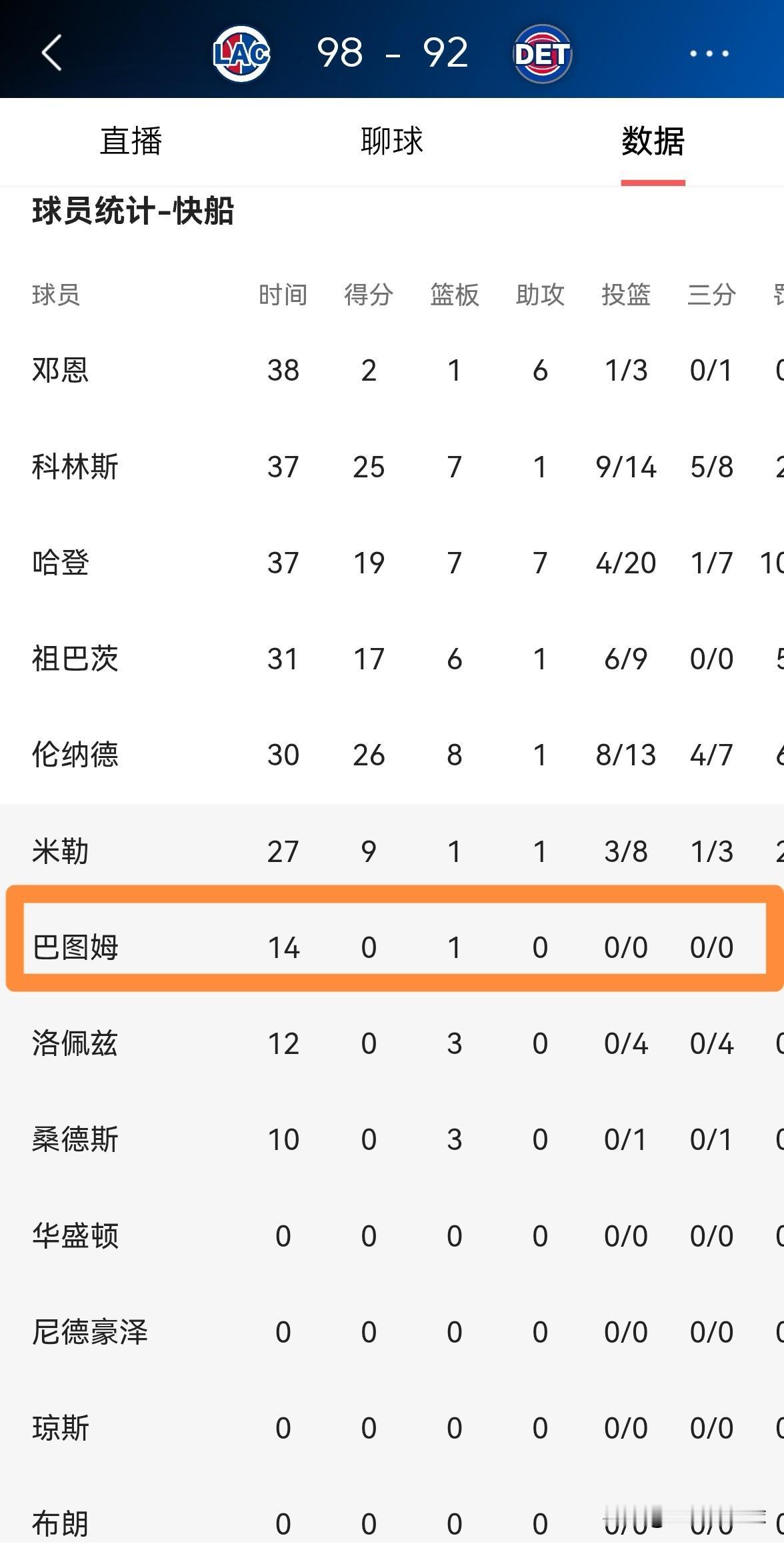 快船老将巴图姆真是出工不出力!在今天快船客场以98:92力克活塞的比赛中,巴图姆替补出战14分钟,没有出手得到0分,不过有1篮板1抢断,他的场上正负值为全队最低的-12。 虽然本场比赛巴图姆在场上看起来非常积极,但是他的场上效果真是非常差,给人一种出工不出力的感觉。