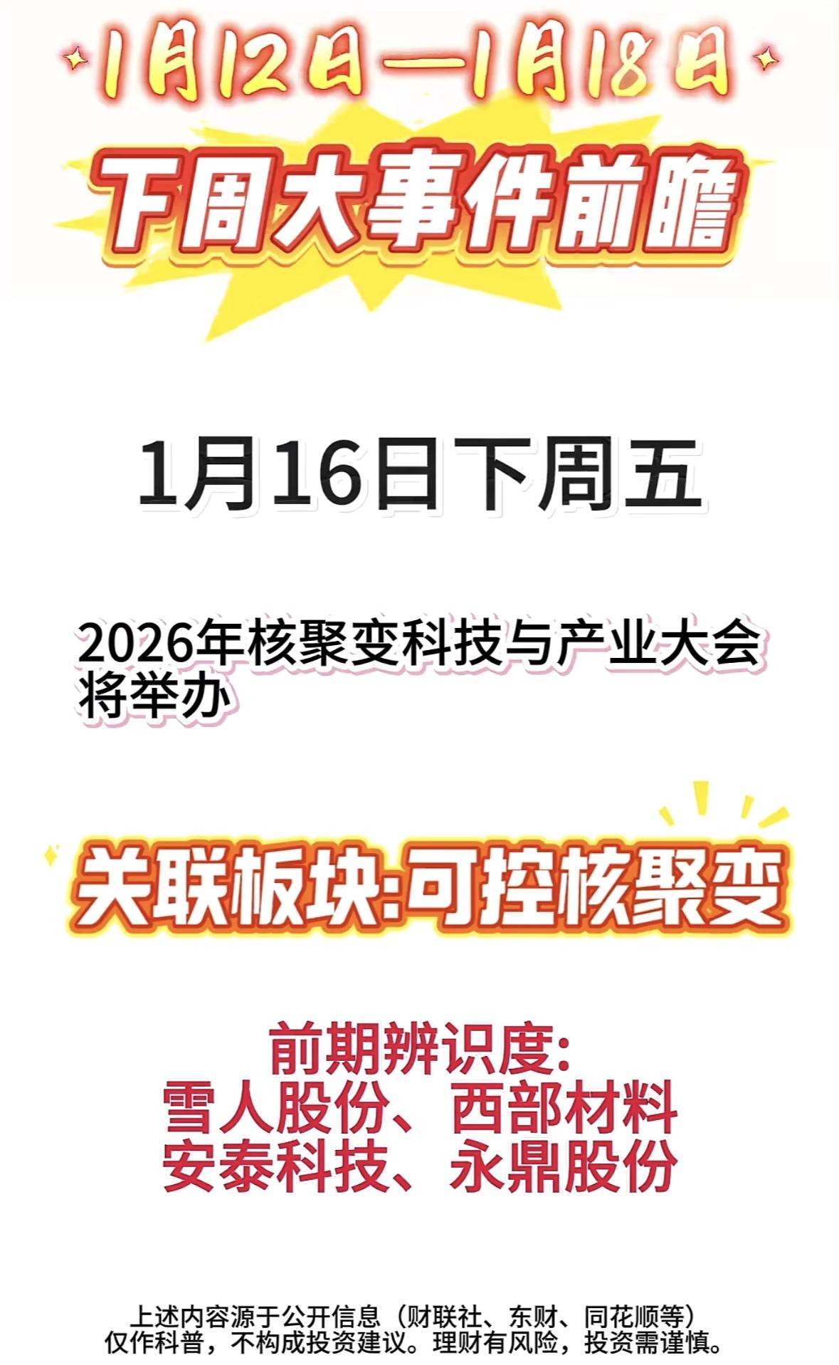 下周大事件前瞻:1月16日核聚变科技大会 深圳将办工业机器人论坛,聚焦前沿发展,相关板块引关注。市场有风险,决策需谨慎。 下周深圳将举办工业机器人论坛,相关板块受关注。个股涉及新春、万向等。市场有风险,投资需理性。