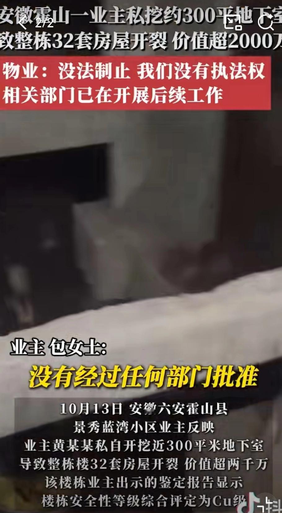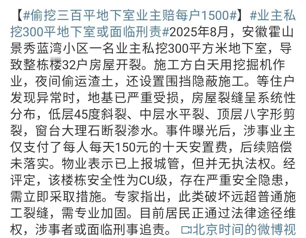 胆太大了吧!安徽霍山一小区业主真是把"自私"玩到了极致,偷偷挖了300平地下室,直接把整栋楼32户人家的房子搞成了CU级危房,这操作简直刷新三观! 说出来你都不信,这业主为了一己私欲,居然白天用挖掘机猛挖,半夜偷偷运渣土,还围起3米高围挡掩人耳目。等邻居们发现墙面开裂时,已经晚了——低层45度斜裂、中层水平裂、顶层八字形剪裂,连窗台大理石都断了渗水,好好的家直接变成"裂缝博物馆"。 更气人的是,造成这么大损失,涉事业主只给每户发了10天每天150元的安置费,总共1500块,之后就不管不顾了。要知道这栋楼被评定为CU级,也就是局部危房,承重结构都受了损,得花大价钱专业加固,1500块连补墙皮都不够! 最让人无语的是物业的回应,一句"没有执法权"就把责任推得干干净净。可这么大规模的施工,挖机轰鸣、渣土外运,怎么可能完全不知情?幸好现在涉事业主已经被逮捕,还可能面临刑事追责,真是大快人心——毕竟这种漠视公共安全的行为,就该付出代价! 其实不止这一起,之前上海、宜宾都有业主私挖地下室被处罚的案例,轻则罚款拆除,重则判刑赔偿。房子是大家的共同家园,哪能凭一己之私随便折腾? 你觉得这1500块赔偿合理吗?物业真的完全没责任吗?如果遇到这种自私的邻居,你会怎么维权?评论区聊聊~ 也提醒大家,遇到小区违规施工一定要及时举报,守住咱们共同的安全底线!业主私挖地下室致楼体开裂 公共安全无小事 危房维权