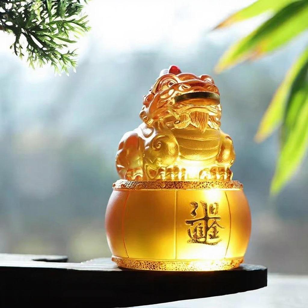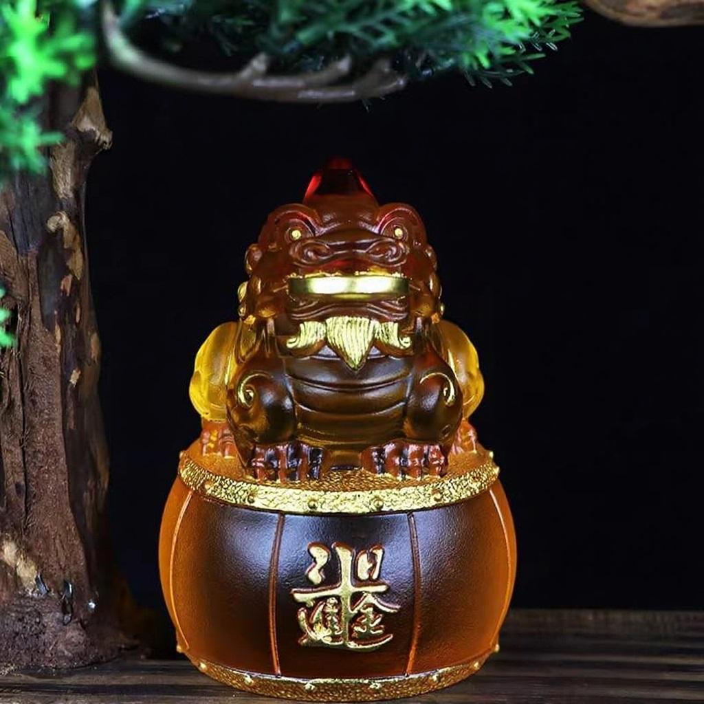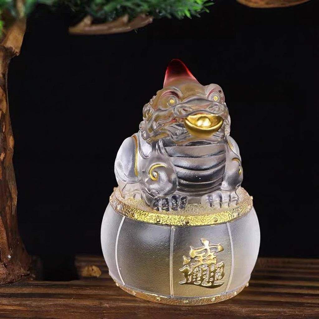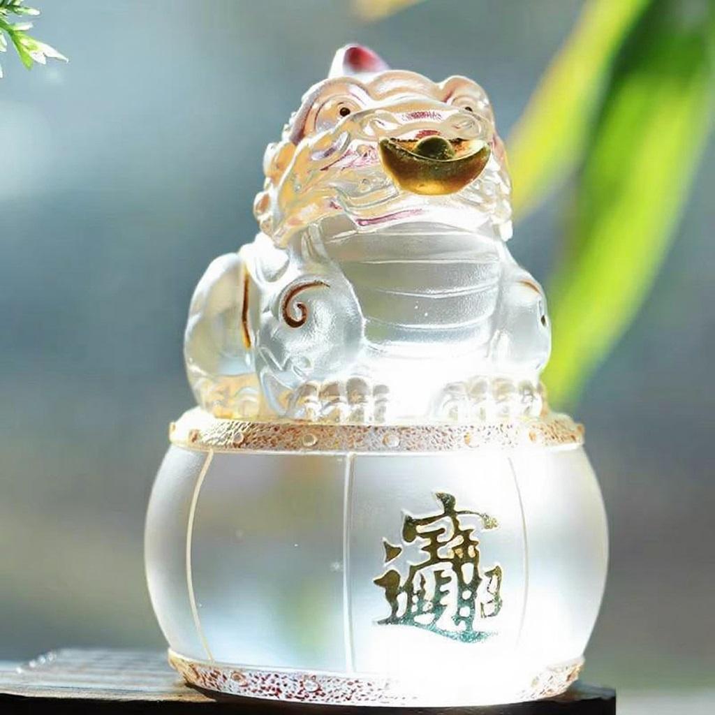 摆件上的琉璃,色彩如流云般变幻,漓彩夺目,在不同的光线下,呈现出迷人的光晕,让人仿佛置身于梦幻之境。其品质晶莹剔透,纯净的质感中,似乎藏着岁月的故事 ,每一处细节都散发着传统工艺的韵味。而貔貅的造型,更是栩栩如生,威风凛凛的神态,仿佛下一秒就要腾飞而起,去守护主人的财富与平安 。贴金工艺的运用,为貔貅增添了一份华贵之气,金色的光芒与琉璃的剔透相互映衬,使其更显庄重与神圣,也让这份祥瑞的寓意更加浓厚。