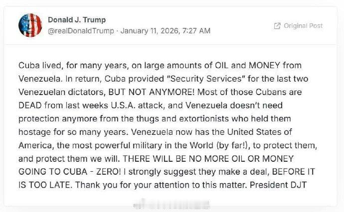 据媒体报道,日前特朗普在谈到美国国务卿卢比奥将成为古巴总统一事时说道:“在我看来,这是个很棒的主意!” 之后,特朗普还要求古巴尽快与美国达成协议: “古巴多年来一直依赖委内瑞拉的大量石油和资金。作为交换,古巴为委内瑞拉的最后两位独菜者提供了"安全保障服务",但这种情况不会再继续下去了。上周美国的袭击导致大多数古巴人丧生,而委内瑞拉不再需要那些多年来挟持他们、勒索他们的暴徒和保护者提供保护。现在委内瑞拉有了美国这个世界上最强大的军队来保护他们,我们一定会保护他们。古巴将不再获得石油、资金——任何东西都不会获得了。我强烈建议他们尽快达成协议,否则就为时已晚了。感谢大家对此问题的关注。”