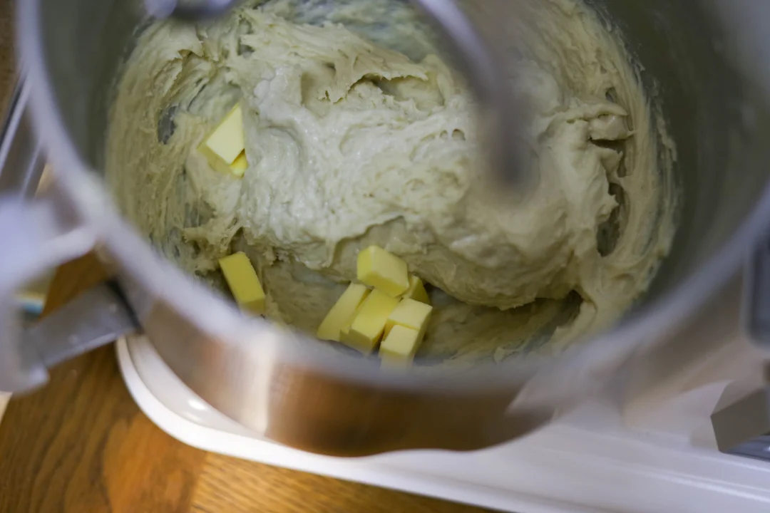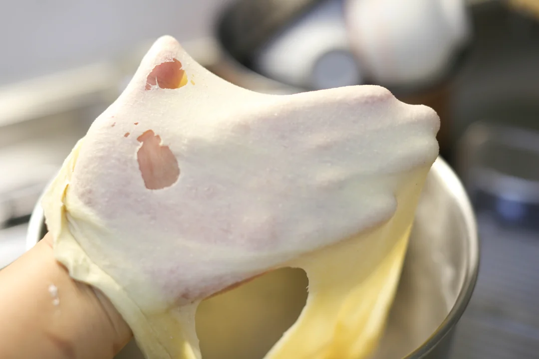 1:把所有材料除了黄油之外,全部放到搅拌机中,低速搅拌到没有干粉的状态,高档位打出后膜状态,加入黄油,3档搅拌到和黄油混合之后,高档位打出手套膜。