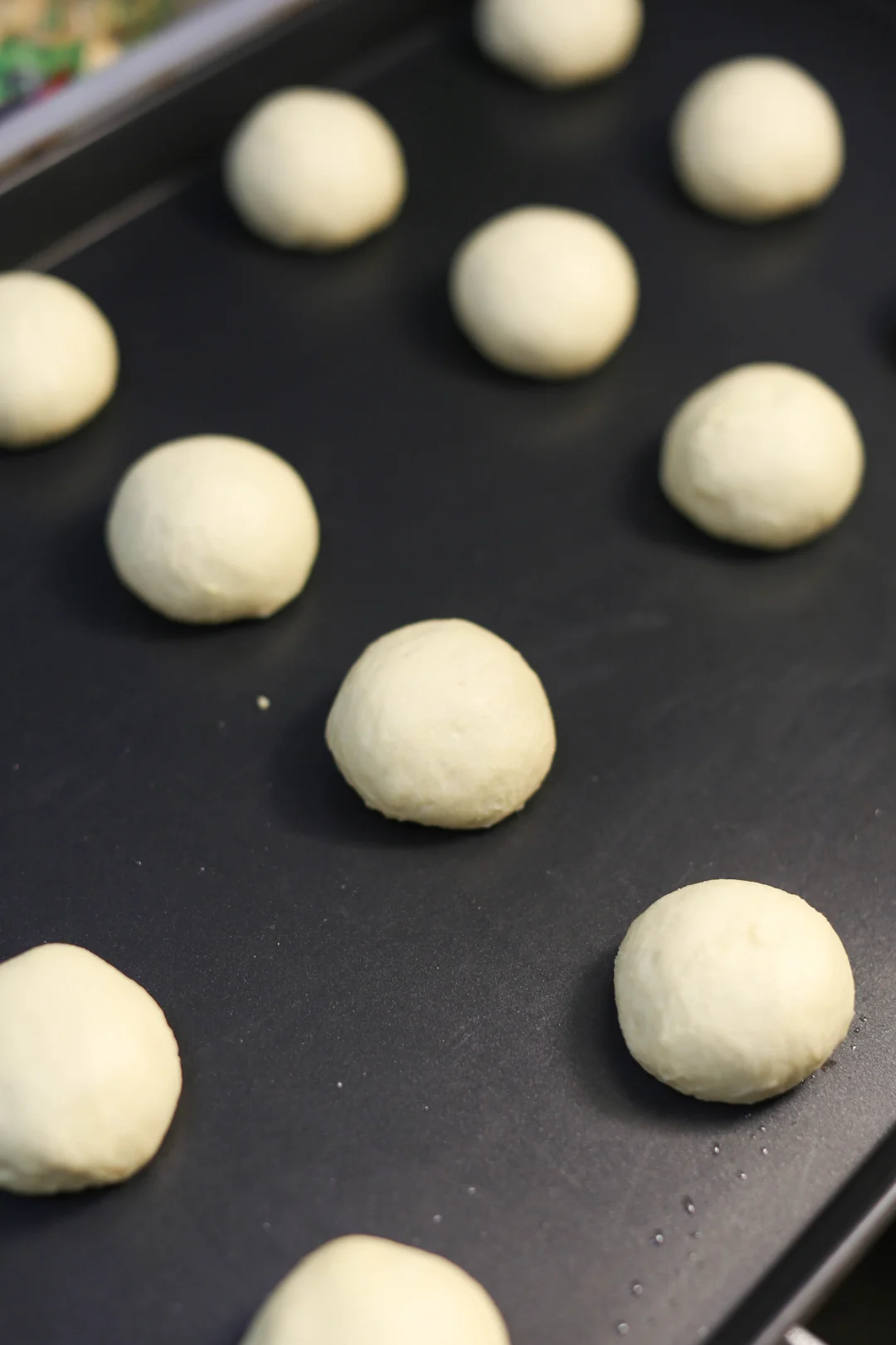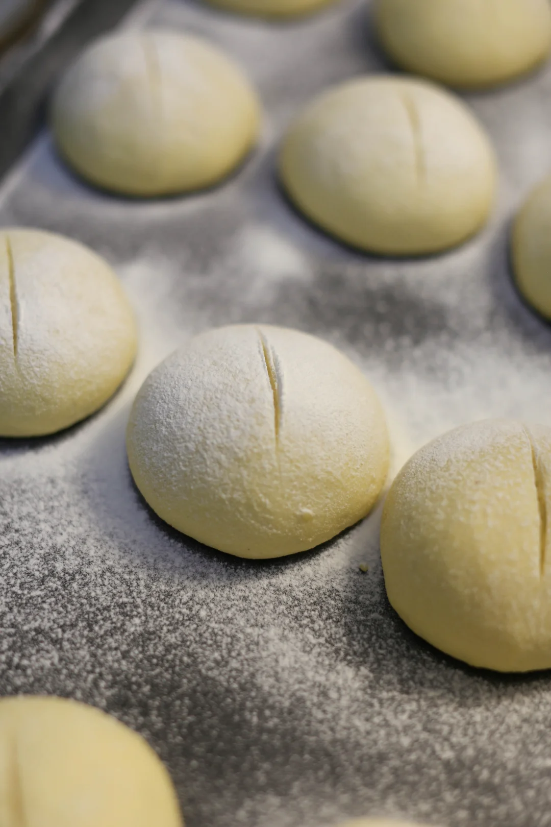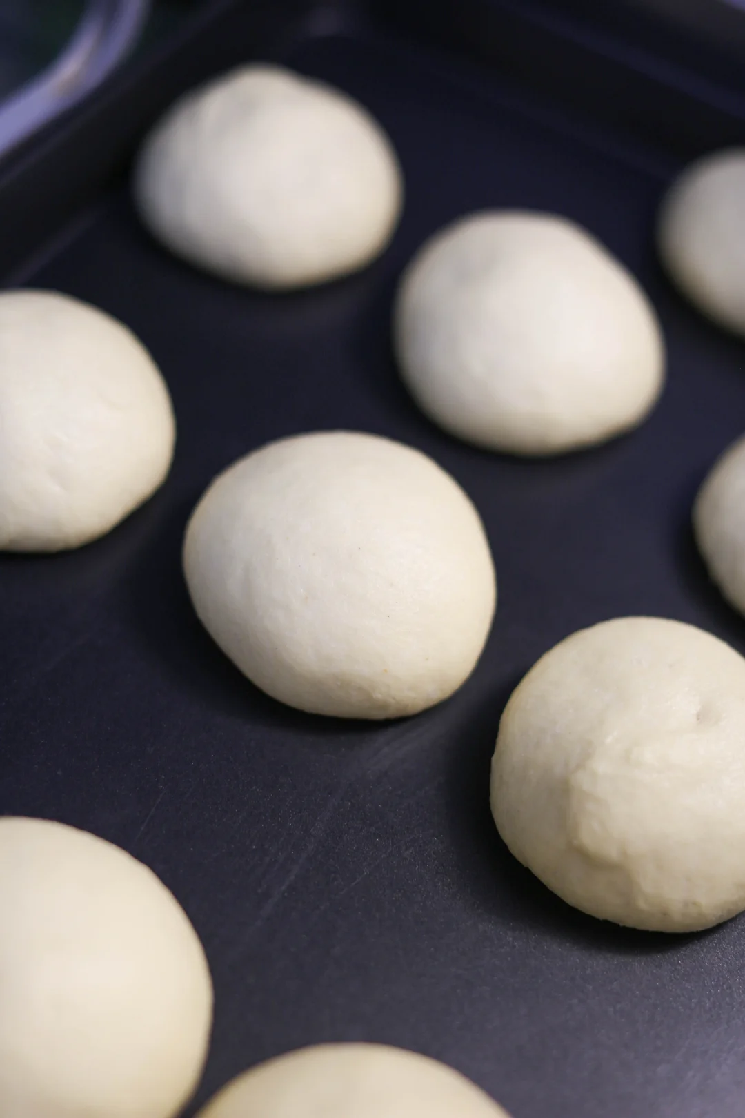 2:搅拌好的面团30度发酵30分钟,因为这个米的面筋支撑性不够,所以在一发的时候不能太久。平均分成60克一个的面团,揉成光滑的圆形直接二发。35度大约40-60分钟左右,发酵到两倍大小。