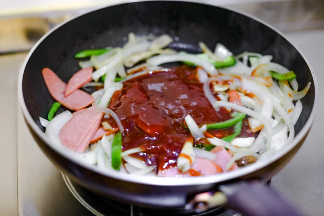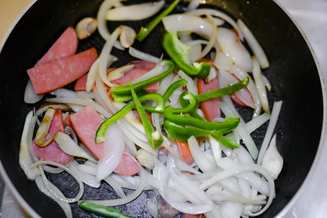 4. 平底锅中放入少量的橄榄油,加入洋葱和菇类炒成金黄色,加入火腿翻炒一下,然后放入青椒丝,加入酱汁。