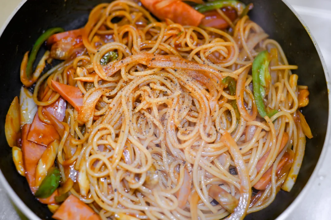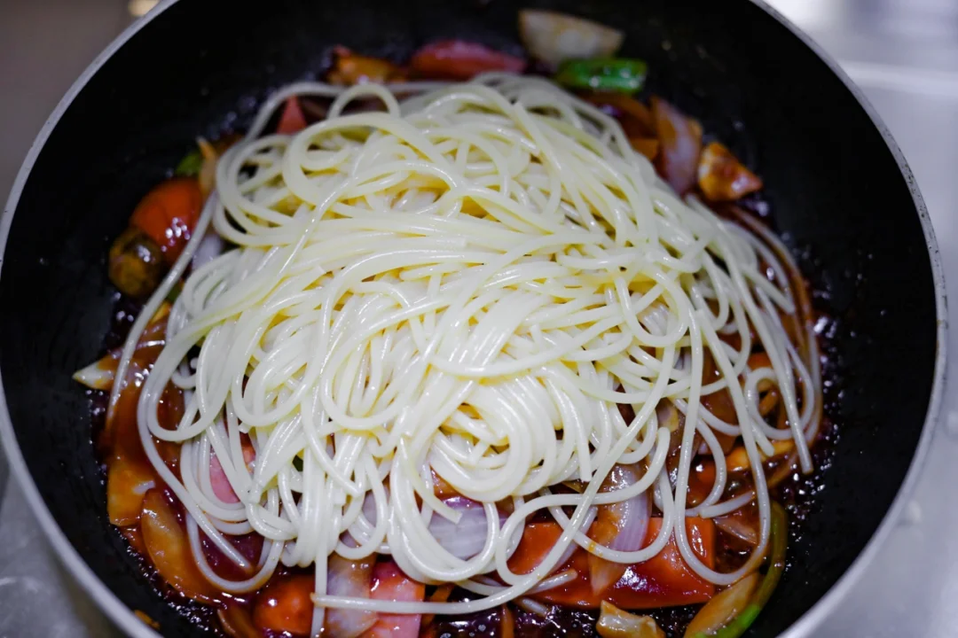 5. 把煮好的意面放入,混合味道。
