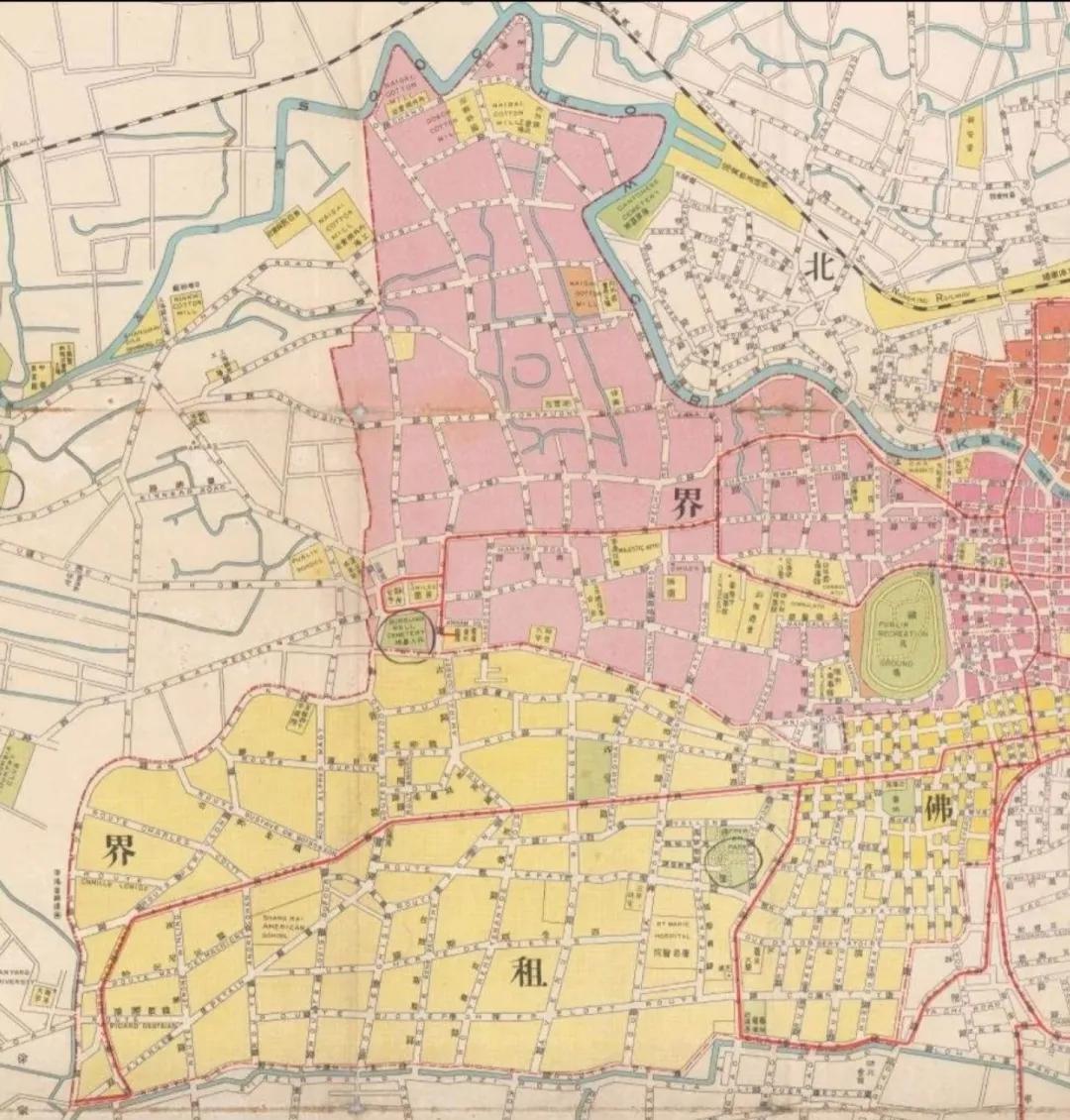 旧法租界(南)和公共租界(北),分界线大致在现在的延安路一线