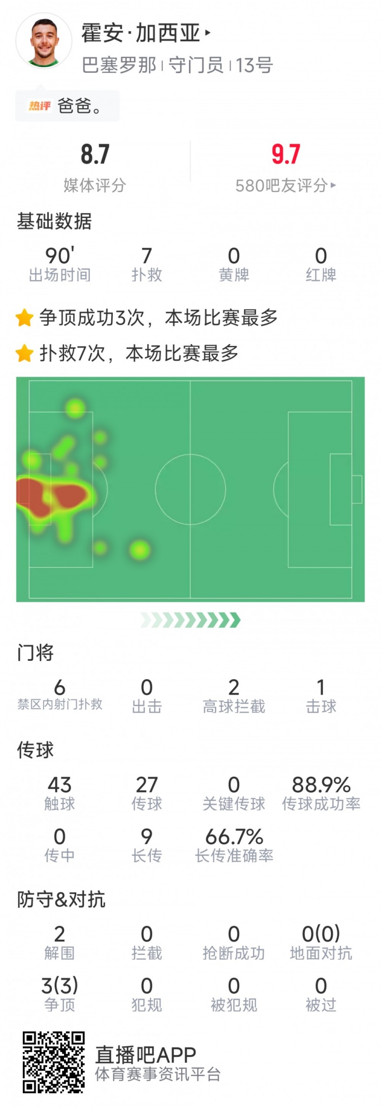 本场比赛巴萨门将霍安·加西亚发挥出色,全场贡献7次成功扑救,43次触球,传球成功率89%,2次解围,3次空中对抗均成功,评分8.7分。