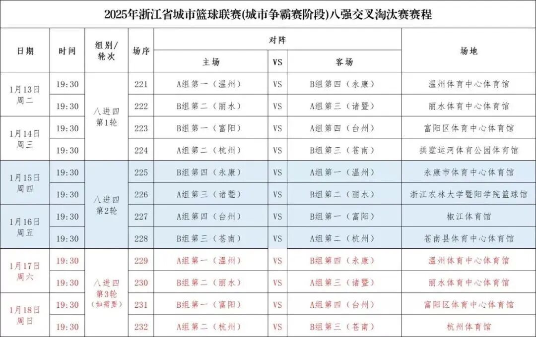 浙BA八强淘汰赛将于1月13日正式开打。