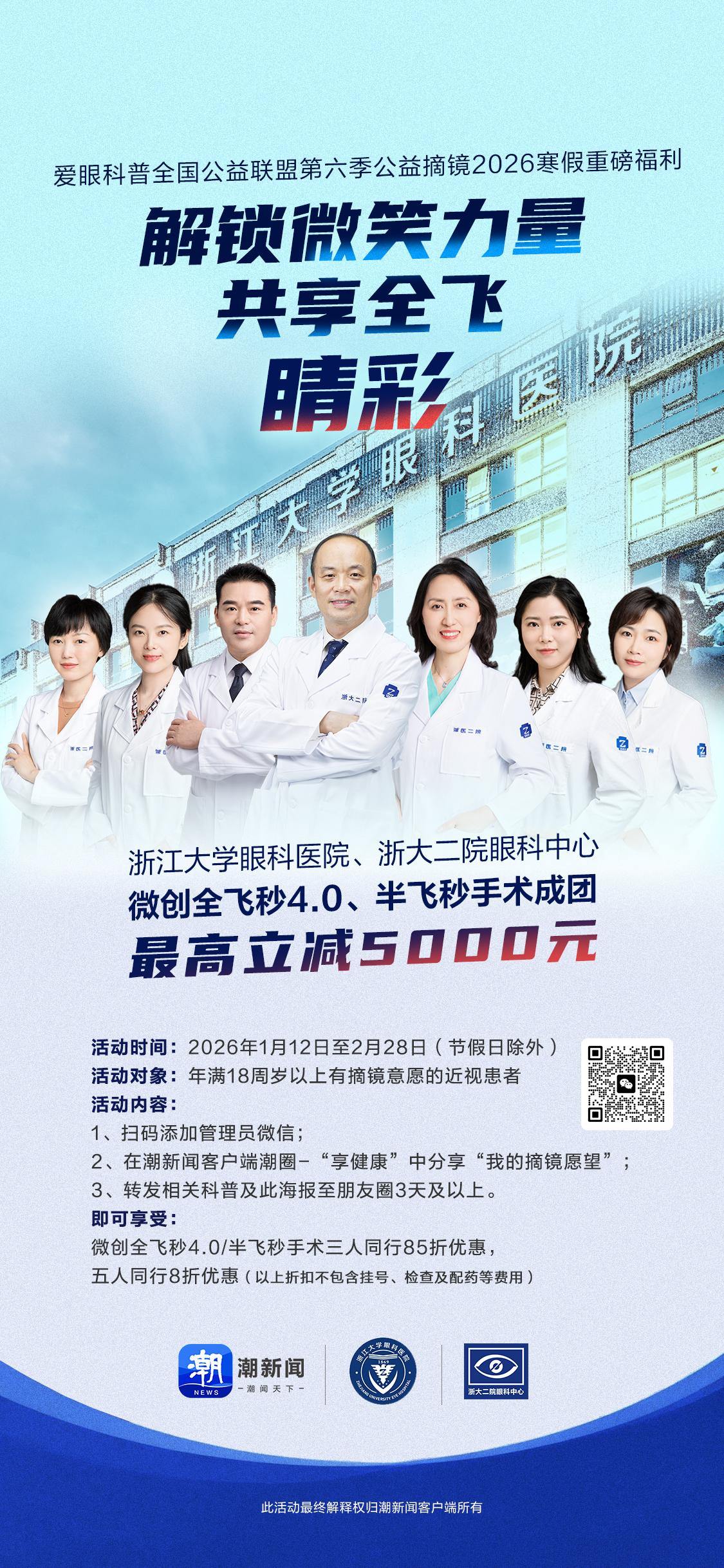 令人期待的摘镜福利也同步官宣:今天起,潮新闻·钱江晚报携手浙江大学眼科医院送出价值千万元的近视激光手术组团福利:三五好友组团,在潮新闻完成报名后,前往该院屈光手术中心接受微创全飞秒4.0或半飞秒近视激光手术,即可享受8~8.5折不等优惠,最高可省5000元!(文末报名)
