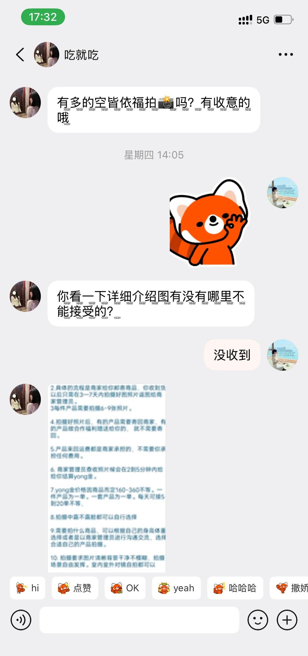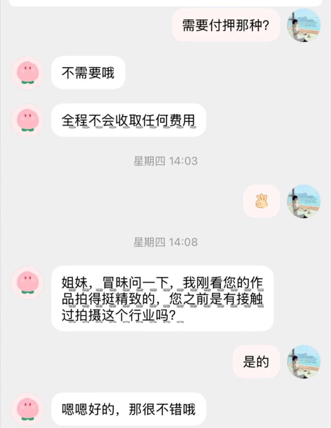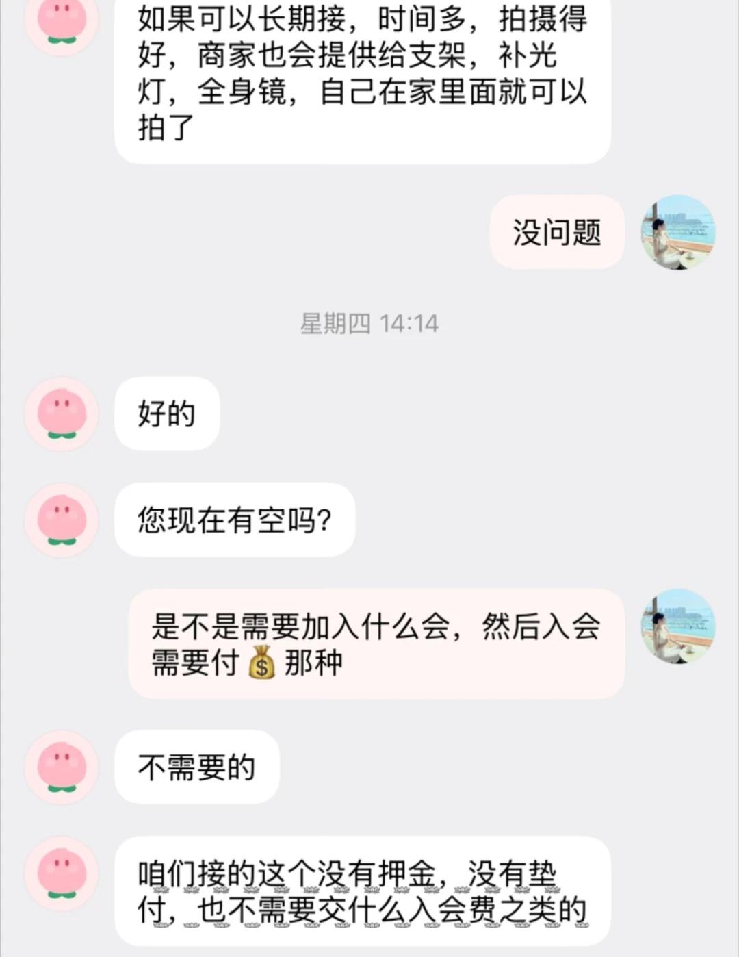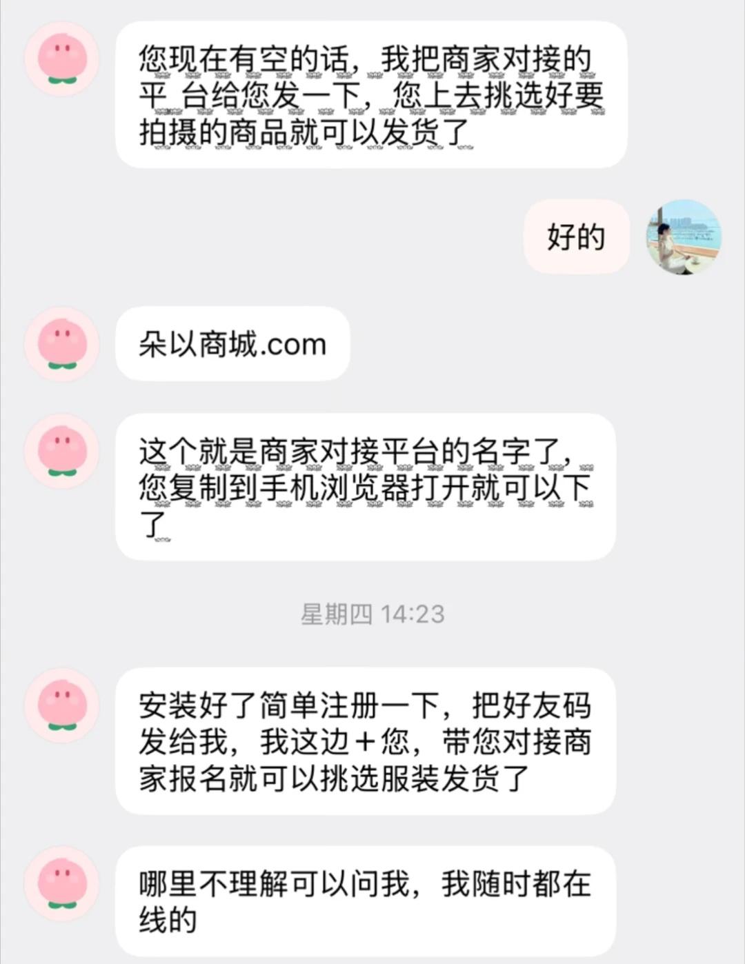 “骗骗”喜欢我 最近出现了很多邀约寄拍的 儿童 女装 男装 女装 包包 说不会收任何fei用 让你放心去沟通 说得很专业的话术让你觉得好像就是商家 然后给你个商城,点开也确实是衣服商城 完了就喊下载个那啥去沟通对接 这里我有觉得不对 但我打开看上面是抖音 淘宝 点开也是卖衣服网页 到这里就会觉得应该不会有什么差错 拉群进去全是讨论接寄拍的, 还有晒自己拍的寄拍照片的 目的应该是让新进群的同学放心不起疑心 我看进群的大多数都是女生也有宝妈 完了就让去挑选想拍的衣服 挑完了就说要去平台安排发货 然后就让我们找客服充值,说这个不是收我们的,说是给抖音,需要有个中间平台保障 以防不寄回衣服或者商家不接款, 听起来好像没毛病的样子, 觉得💰也不是很多,说充值了也能提现 然后就喊做什么任务, 完成了多少才能安排快递衣服, 到这里我就觉得不对头了,多半是诈骗, 当然他们目的并不是这点,肯定是更多, 后续还没来,就赶紧来发篇让大家都看到,以免有更多的姐妹被忽悠进去 敲重点❗️不是一个平台,有很多个名字,不同方式,但凡让你去下什么 录什么 付什么,通通沙掉[坏笑R] 反诈开学第一课 社区公约 未成年反诈指南 想让更多人看到