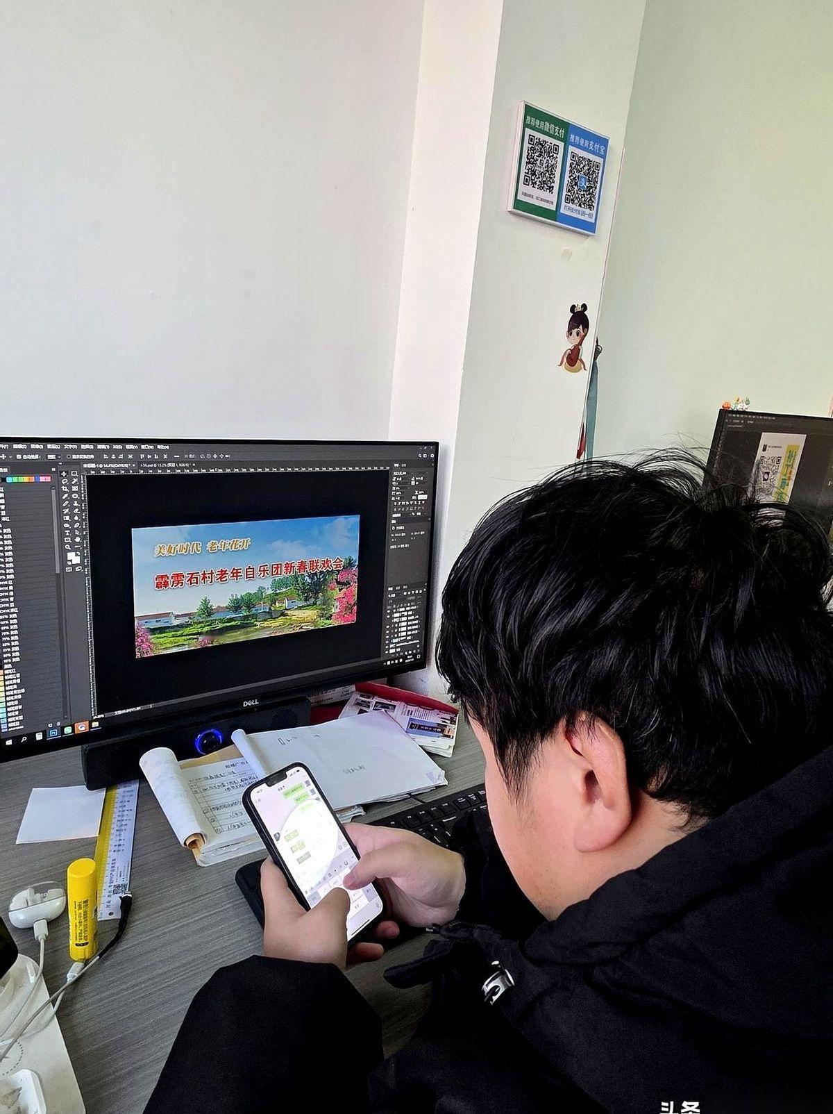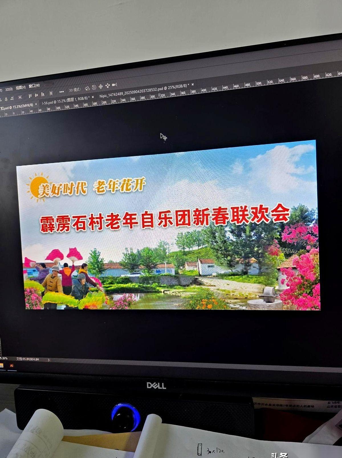 这小伙子也是第一次。 他想给我整个大红大紫的模板,糊弄一下完事儿。 我当时就说,不行,推倒重来。 这是我们村,第一次正儿八经给老人们办的“村晚”,怎么能用模板?那上面得有咱们村的蓝天、红瓦、绿树,有小桥流水人家。 得有我们村自个儿的魂。 小伙子有点蒙,素材库里翻不出我要的“感觉”。 我也不废话,直接掏手机,把我去年夏天拍的村景、前天拍的大妈跳舞、邻居家门口的花……一张张全给了他。 我说,再把这个石碾子给我P上去,对,就这个角落,这才有咱们村的味儿。 来来回回折腾了小半天,终于弄完了。 往回走的路上,我越想越不对劲,脑子里突然“咯噔”一下。 这事儿,不能只干一次啊。 对于老人们来说,“来年”这个词,分量太重了。你得给他们一个实实在在的盼头。 我立马给那小伙子打电话。 “赶紧!在最前头给我加上‘首届’两个字!” 有了首届,就得有第二届,第三届……这事儿,才算真的活了。 也有朋友劝我,别花这冤枉钱,用他们单位现成的背景板得了。 我看了一眼,摇了摇头。那上面没有咱们村的老人,没有新春,没有那股子大伙儿自个儿找乐的劲儿。 宁愿自己掏钱,这事儿也不能凑合。 是,我知道这背景板挺“土”的,也挺寒酸。 现在谁还用这个啊,都上大电子屏了。 咱租不起。 但我就觉得,这块3米乘6米的画,往那一杵,比什么电子屏都带劲儿。 因为上面有我们自己的日子,有我们对来年的全部指望。