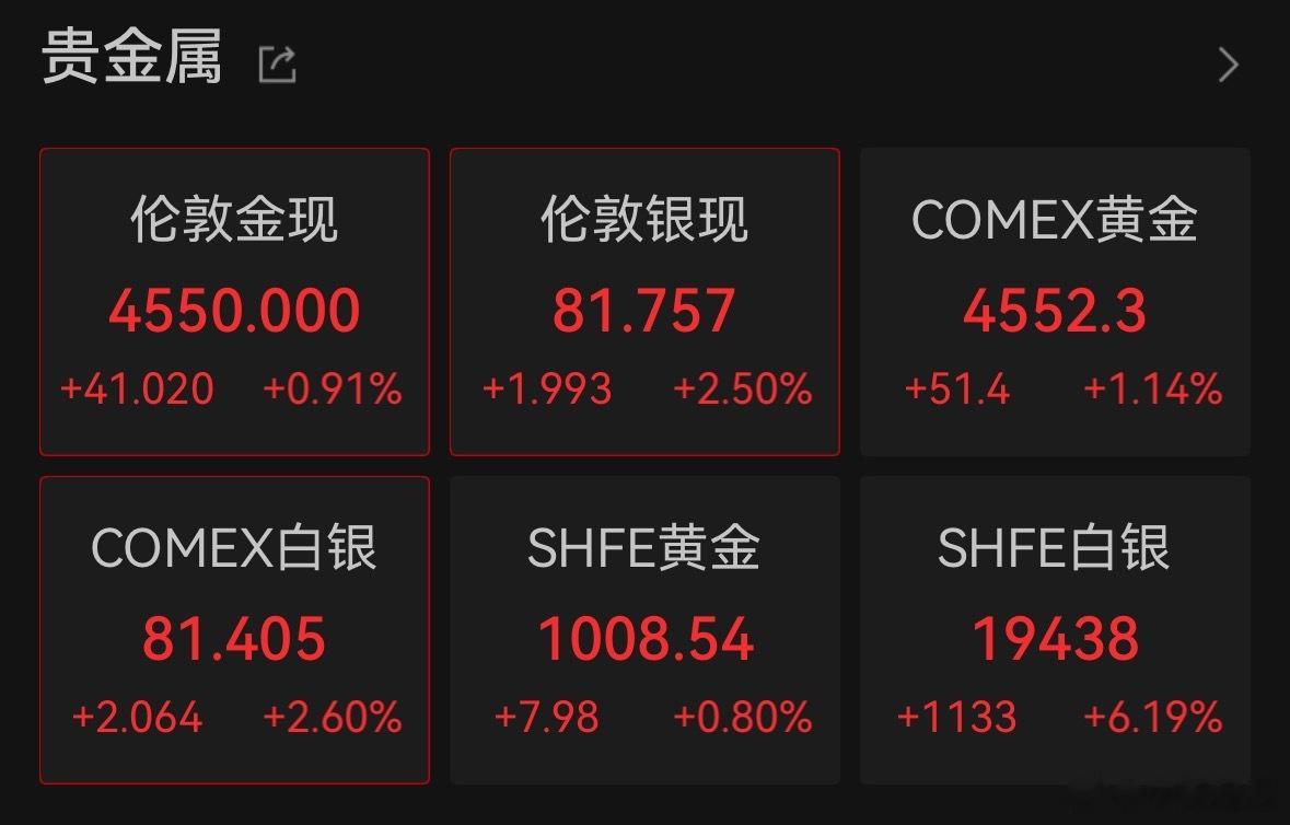 [#黄金白银又直线拉升#]#现货黄金站上4550美元#周一早间,现货白银与现货黄金集体直线拉升,截至发稿,现货白银向上突破81美元,现货黄金直线拉涨至4550美元大关,时隔两周再度创下历史新高。