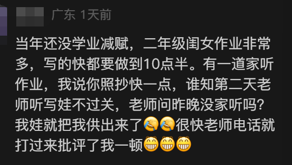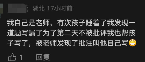 有网友就说,自己是当老师的,“有次孩子睡着了我发现一道题写漏了,为了第二天不被批评我也帮孩子写了。”