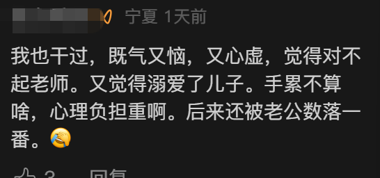 “我也干过,既气又恼,又心虚,觉得对不起老师,又觉得溺爱了儿子,手累不算,心理负担重啊,后来还被老公数落一番。”有网友说。