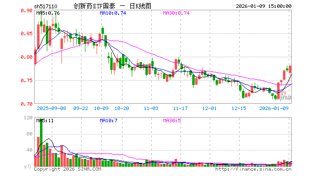1月9日,创新药ETF国泰(517110)涨1.43%,成交额779.61万元。当日份额减少100.00万份,最新份额为5.79亿份,近20个交易日份额增加500.00万份。最新资产净值计算值为4.53亿元。