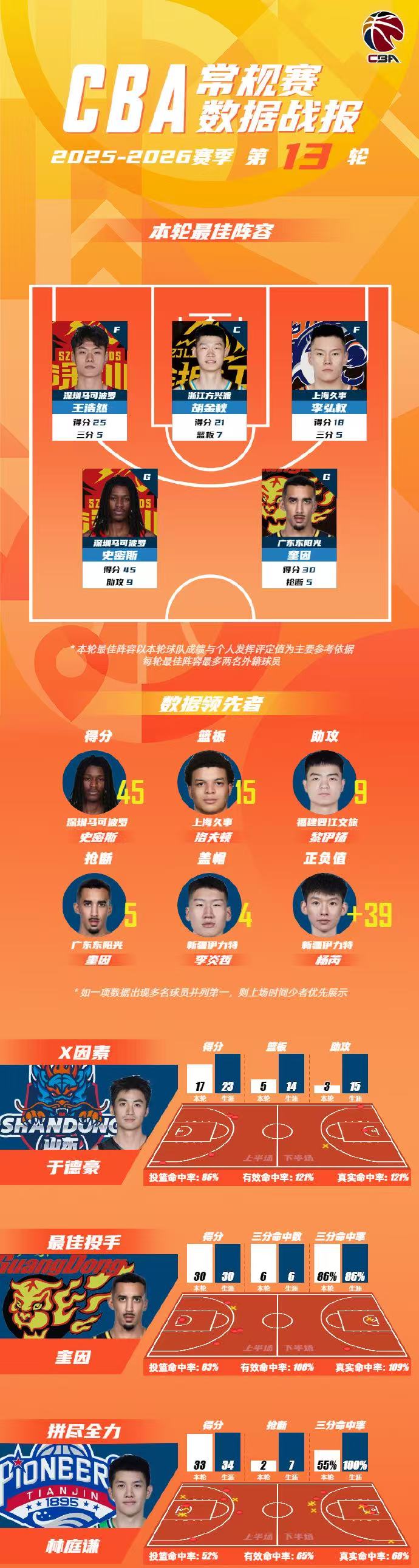 2025-2026赛季CBA联赛常规赛第13轮结束较量,来自浙江广厦篮球俱乐部的胡金秋,上海久事大鲨鱼篮球俱乐部的李弘权,广东宏远篮球俱乐部的奎因,深圳新世纪烈豹篮球俱乐部的王浩然和史密斯入选CBA联赛常规赛第13轮最佳阵容!