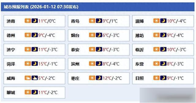 12日白天到夜间,全省天气晴到少云。潍坊、日照、鲁西北、鲁中山区和半岛地区南风4~5级阵风6~8级转北风3~4级,其他地区南风4级阵风5~6级转北风3~4级。夜间最低气温:鲁中山区和半岛内陆地区-4°C左右,其他地区-2°C左右。最高气温:滨州、东营、鲁中山区和半岛地区6°C左右,聊城、菏泽和济宁11°C左右,其他地区9°C左右。