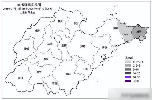 11日06时至12日06时,全省共有2市、9县(市、区)出现降雪,平均降雪量0.1(毫米,下同)。各市平均:威海2.1和烟台0.4,其他市无降雪。县(市、区)平均降雪量超过2.5的3个,0.1—2.5的6个,前3位的是:威海荣成4.6、威海文登4.2和威海市区2.7。最大积雪深度排前3位的是:威海本站21厘米、威海文登17厘米和威海荣成15厘米。