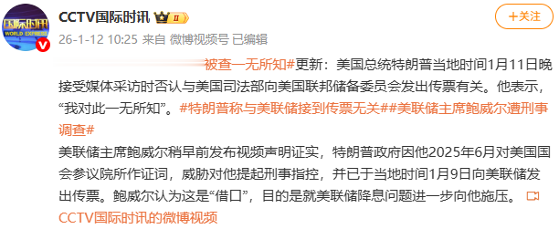 据CCTV国际时讯微博消息,美国总统特朗普当地时间1月11日晚接受媒体采访时否认与美国司法部向美国联邦储备委员会发出传票有关。他表示,“我对此一无所知”。