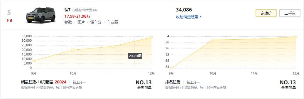 12月份销量公布了,特斯拉毛豆Y断崖式领先小米YU7而且是没有任何前缀条件的销量榜,但12月赶上购置税全免的最后一个月,下个月再看看1月的销量如何,猜猜能卖多少 另外是排在第五名的钛7,当初真没看错它从上市开始,销量就一路上涨,势头很猛啊【来自懂车帝车友圈】