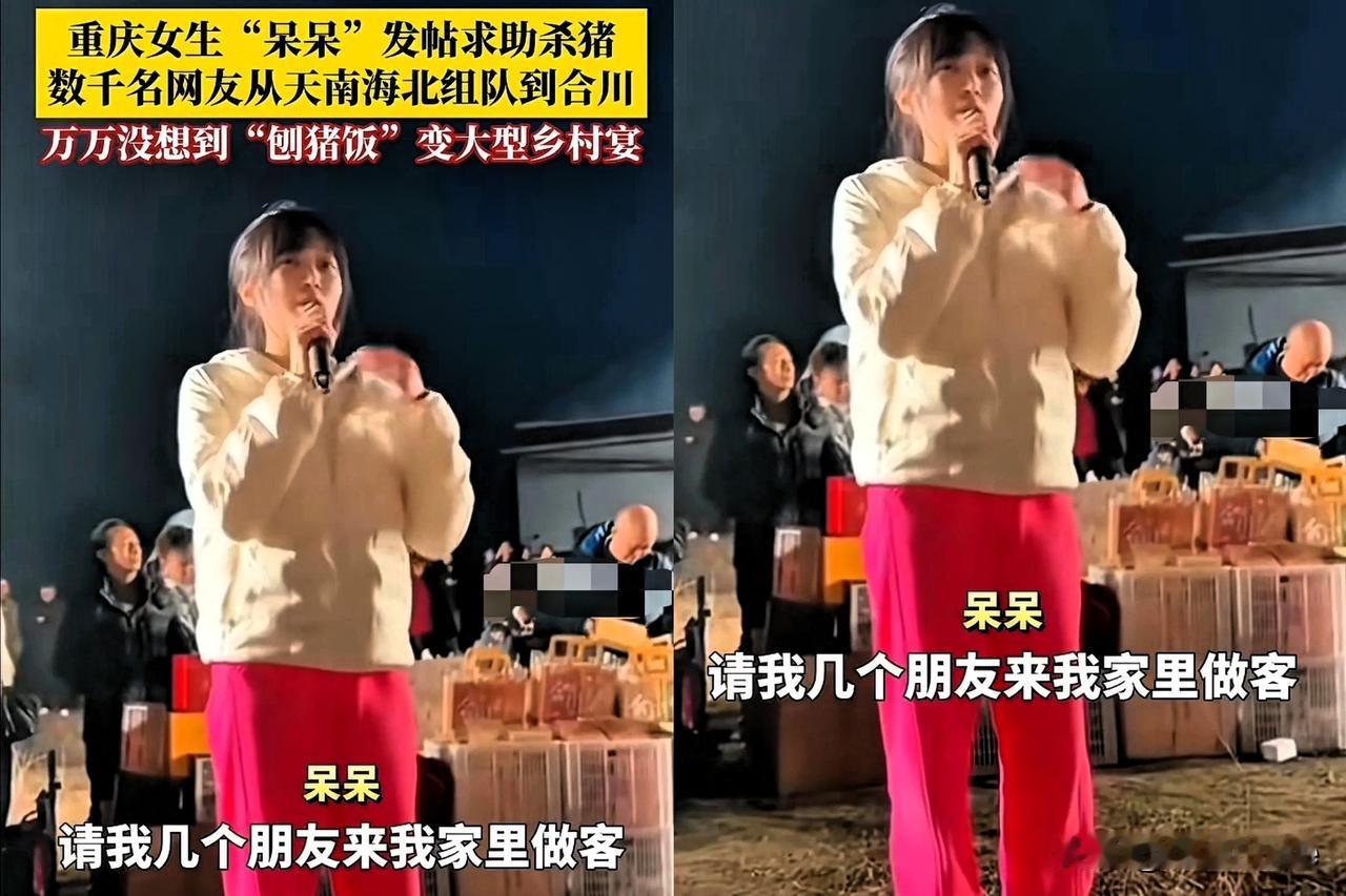呆呆:我好像闯了个大祸 合川文旅:没事 这好事我接得住! 2026年才没几天,重庆合川的小女生呆呆, 就凭一条帖子搞出了大动静! 她发帖喊话:“1月11号家里杀两头猪,来帮忙按猪的管饭!目标是家门口停满车,比结婚还热闹,让我在村里扬眉吐气!” 本以为就是小姑娘的小小心愿,结果全网网友直接疯狂!赶来的车子排到村外好几里,把小村子堵得水泄不通。文旅部门火速赶来搭手帮忙,交警蜀黍也全员出动维持秩序! 最后十万人在线云围观,四千多人现场撸袖子帮忙、啃肉喝汤,热闹得不像话! 这场杀猪宴的爆火,哪里是为了吃肉,分明是大家都馋这口久违的人间烟火气!比起刻意打造的网红打卡点,这种普通人自发的热热闹闹,才是治愈快节奏生活的良药,毕竟最动人的快乐,从来都藏在这些接地气的小事里