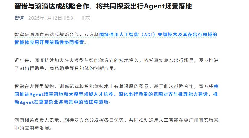 1月12日,智谱与滴滴宣布达成战略合作,双方将围绕通用人工智能(AGI)关键技术及其在出行领域的智能体应用开展前瞻性协同探索。