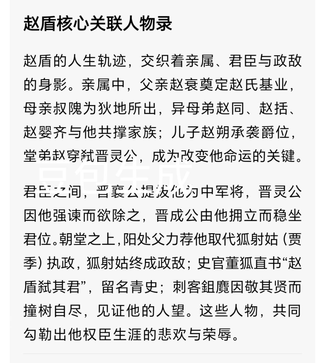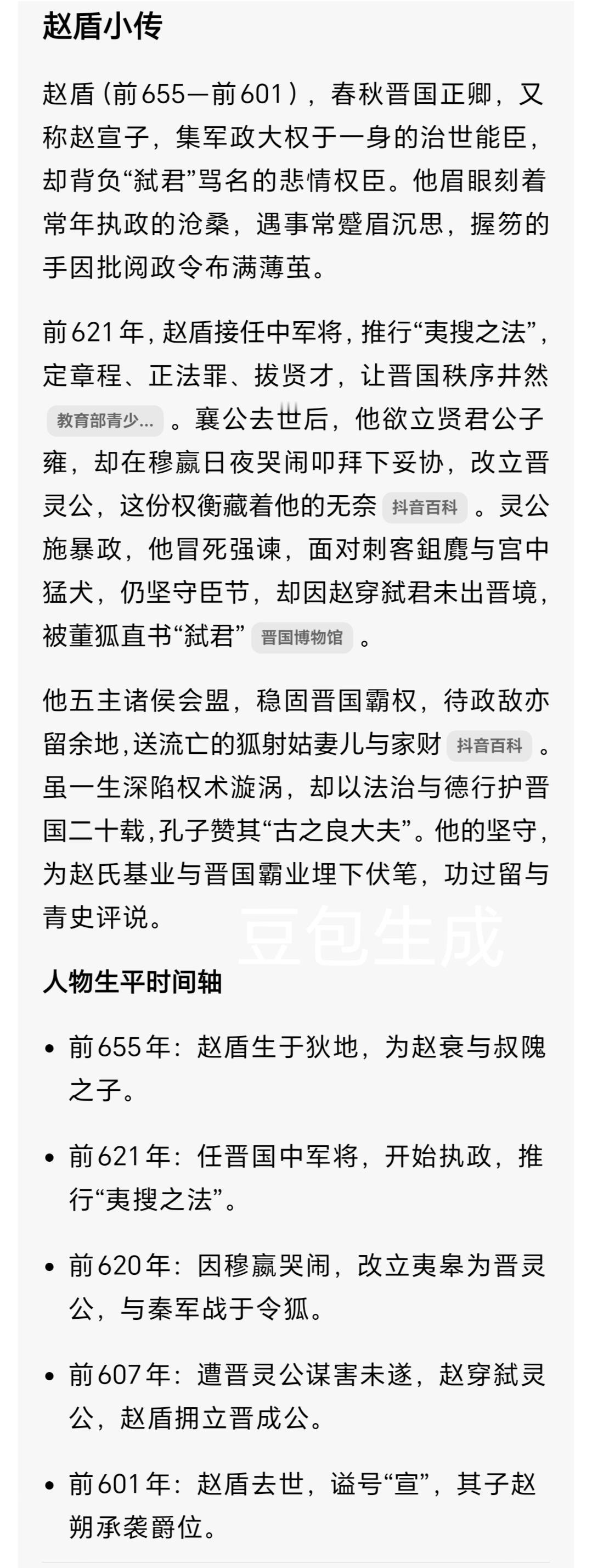 被“弑君”二字毁掉的贤相:赵盾的冤屈藏着春秋最残酷的权力游戏——揭秘周朝晋国卿大夫赵盾:背负弑君名的霸业守护者 冬日的晋国都城绛(jiàng)城,寒风卷着落叶穿过宫阙。四十余岁的赵盾身着朝服立于朝堂,作为晋国中军将兼执政正卿,他一手执掌晋国军政大权,却因太史董狐的一笔“赵盾弑其君”,在史书里留下了充满争议的注脚。而这位权倾朝野的大臣,最终得以善终,其一生的荣辱沉浮,恰是春秋时期晋国权力博弈的缩影。 流亡背景下的崛起:从庶子到晋国执政 赵盾的父亲赵衰(cuī),是晋文公重耳流亡时的“五贤士”之一,深得重耳倚重。赵盾本是赵衰与狄女叔隗所生,早年因母亲身份,在家族中并非显要。直至晋文公之女赵姬(赵衰正妻)主动让贤,迎回叔隗母子,并立赵盾为赵氏嫡子,他才获得了继承家族的正统地位。 公元前621年,晋襄公病逝,太子夷皋(gāo)年幼,晋国朝堂陷入立君与权力分配的纷争。当时晋国诸卿原本商议立晋襄公之弟公子雍,且拟任命贾季(狐射姑)为中军将。但太傅阳处父(赵衰旧部)归国后,以“赵盾贤能且果敢”为由,力主改立太子夷皋为君(即晋灵公),并推举赵盾出任中军将。这一决定让赵盾越过资历更深的贾季,成为晋国历史上最年轻的执政正卿,一手掌握晋国的军政核心。 初掌大权的赵盾,立刻推行了一系列影响深远的改革。据《左传》记载,他“制事典,正法罪,辟刑狱,董逋(bū)逃,由质要,治旧洿(wū),本秩礼,续常职,出滞淹”,将晋文公时期的临时法令系统化,厘清司法案件、整顿社会秩序、选拔被埋没的人才。这些改革让晋国的政治与法律体系更趋完善,为晋国霸业的延续筑牢了根基。 改革触动了旧贵族的既得利益,大夫臾骈(yú pián)曾劝他“变法宜缓,免生怨怼(duì)”。赵盾望着父亲手植的槐树,坦言“晋室霸业摇摇欲坠,非猛药不能救”,坚持推进改革,展现出强硬的政治决心。 与晋灵公的冲突:从劝谏到生死博弈 晋灵公成年后,逐渐显露昏庸暴虐的本性。他横征暴敛,耗费民力修建华丽的宫墙;还曾从高台上用弹弓射人,以观看百姓躲避弹丸为乐;甚至因厨子未能炖熟熊掌,便将其残忍杀害,把尸体装在竹筐中让宫女抬出宫外。 赵盾作为执政卿,屡次直言劝谏。《左传》记载,面对赵盾的“骤谏”,晋灵公表面敷衍“吾知过矣,将改之”,暗中却派刺客鉏麑(chú ní)前往赵府行刺。鉏麑潜入时,见赵盾早已穿戴整齐,端坐等待上朝,只是因时间尚早暂作休憩。他被赵盾的勤政与恭敬打动,叹息“不忘恭敬,民之主也”,最终撞树自尽,不忍加害。 刺杀失败后,晋灵公又设下鸿门宴。他假意宴请赵盾,暗中埋伏甲士,计划在席间杀之。赵盾的侍卫提弥明察觉异常,快步上殿直言“臣侍君宴,过三爵,非礼也”,拉着赵盾迅速离席。灵公见状,下令放出獒犬追咬,提弥明拼死搏杀獒犬,最终战死。危急时刻,埋伏的甲士中一人突然倒戈,护送赵盾突围——此人正是灵辄(zhé),早年曾在首阳山被赵盾救助过的饿汉,为报恩挺身而出。 “弑君”疑云:史笔如铁的春秋评判 侥幸逃脱的赵盾被迫离开绛城,准备流亡他国。尚未走出晋国边境时,传来了堂弟赵穿在桃园袭杀晋灵公的消息,赵盾随即返回都城,重新主持朝政。 晋国太史董狐在史简上郑重写下“赵盾弑其君”,并在朝堂上公示。赵盾辩解“弑君者是赵穿,并非我”,董狐反驳:“你身为正卿,逃亡未越境,返回后又未讨伐弑君之贼,罪责自然归于你。”赵盾默然,只叹息“我之怀矣,自诒伊戚(我的眷恋,自招忧伤)”,并未利用权力篡改史书。 后世学者对此争论不休,实则董狐的评判源于春秋时期的“礼”与“责”:赵盾作为执政者,对君主的死负有不可推卸的责任,这也成为他一生无法抹去的标签。 权力平衡与落幕:晋国霸业的延续者 赵盾迎立晋成公即位后,展现出成熟的政治智慧。他提议设立“公族大夫”制度,让卿族子弟进入宫廷侍卫体系,既安抚了各卿族势力,又将其子弟纳入管控,巧妙平衡了晋国的内部权力。此时的赵盾仍牢牢掌握中军将之位,直至去世都未放权,并非原文所言“让位于荀林父”(荀林父在赵盾死后的晋景公时期才任中军将)。 赵盾执政近二十年,始终致力于维系晋国的霸主地位,对内稳定政局,对外抗衡楚国。公元前601年,赵盾病逝,晋成公赐谥号“宣”,按谥法“善闻周达曰宣”,认可了他的政绩。 赵盾死后,赵氏家族一度遭遇“下宫之难”,几乎灭族,幸得韩厥相助,赵盾之孙赵武(赵氏孤儿)得以幸存,后来复兴赵氏,其子孙最终建立战国七雄之一的赵国。 赵盾的一生,是春秋时期权臣的典型写照:他有治国安邦的才能,推动晋国制度革新,延续了晋国的霸业;却因君臣伦理的纠葛,背负“弑君”之名。而太史董狐的直笔,与赵盾不篡改史书的选择,共同铸就了中国史学“秉笔直书”的传统,这也成为赵盾故事中最耐人寻味的部分。董狐直笔 晋灵公之臣