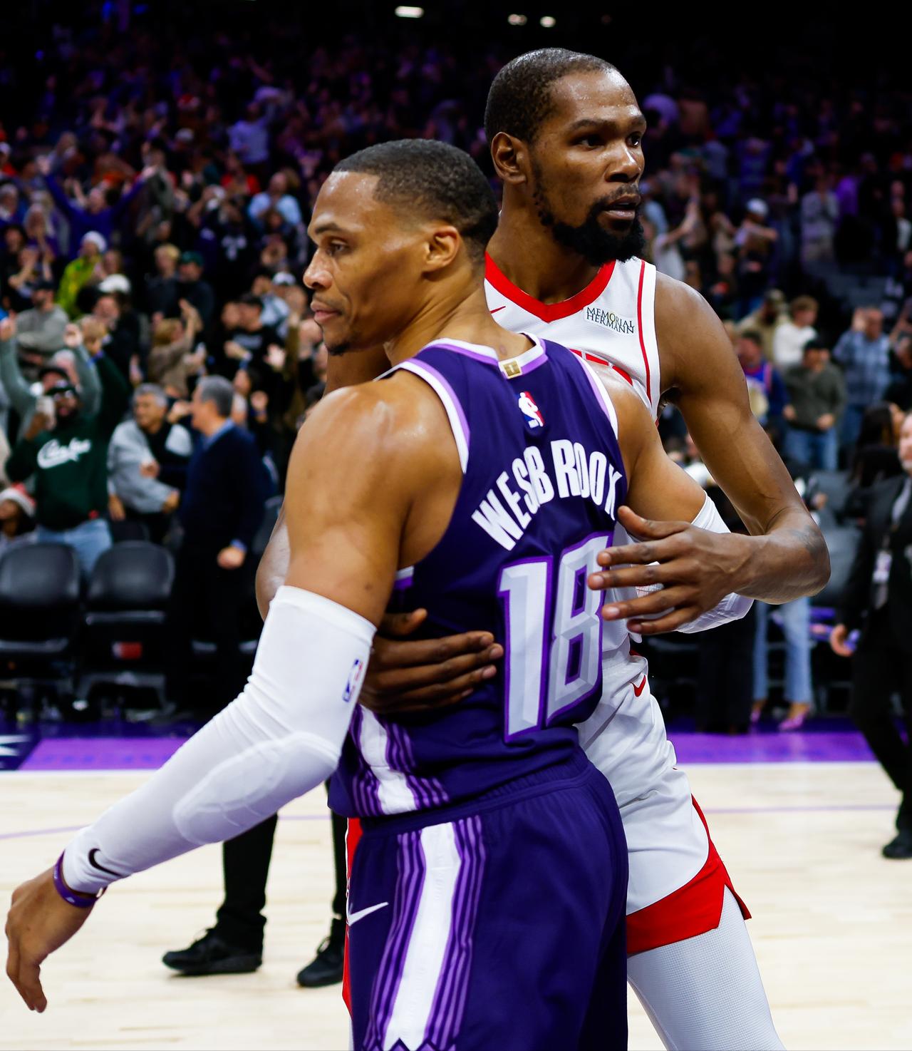 火箭非常离谱的“3连败”: ——火箭102-103开拓者(西9) ——火箭105-111开拓者(西9) ——火箭98-111国王(西15) 国王在对阵火箭之前,是7连败+西部倒数第1,打完这一场,自己终结连败,升到西部倒数第2,同时送给火箭三连败,并把火箭打到了附加赛区域。 威少碰见杜兰特,确实有buff加成,情绪是120%的饱满,全场三分球6中3,最后时刻底角三分打崩火箭的追分信心,威少仰天长啸。 很显然,他对于这个大哥,依然有很大的意见。