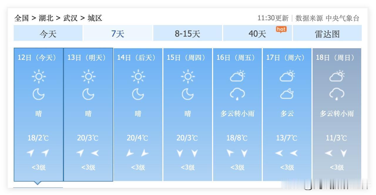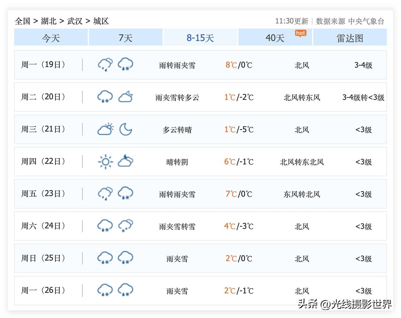 啊啊啊!1月12日,湖北省武汉市,冲刺18度高温!1月12日到16日,武汉市,持续多云晴好,最高气温20度,超级暖冬来袭!三九寒冬,居然如此温暖!不过,超强冷空气已经在准备发货了!武汉市,即将飘雪花! 1月19日到26日,武汉市,湖北省,大范围雨雪天气……雨夹雪,下雪……飘雪花…… 1月24日,武汉可能真的下雪! 断崖式大降温!武汉这波大降温,降温幅度20度左右!我的个天啊! 1月21日,武汉气温暴跌至1度到-5度。