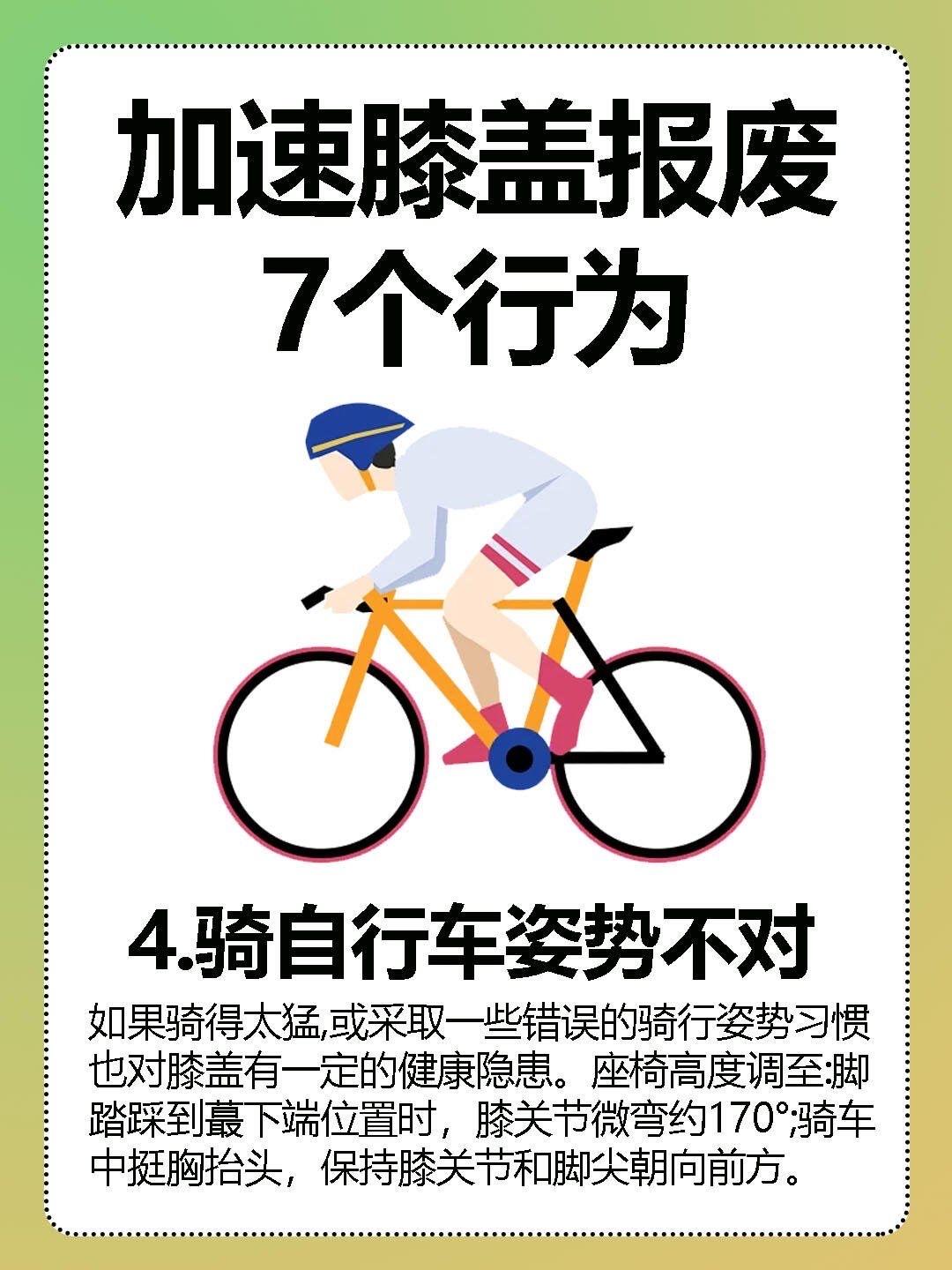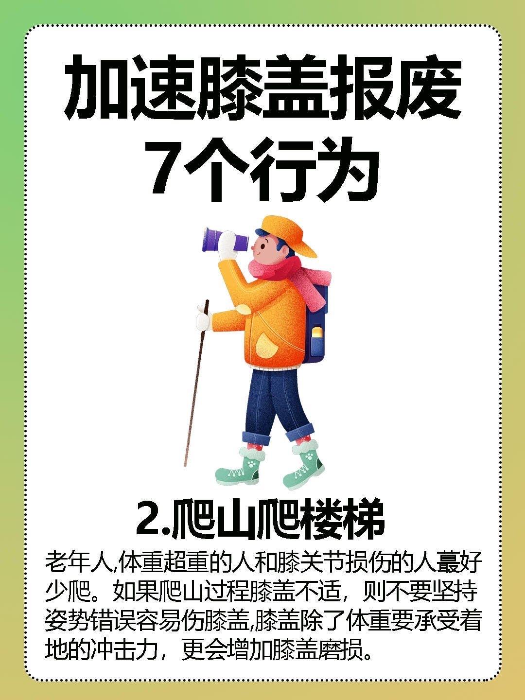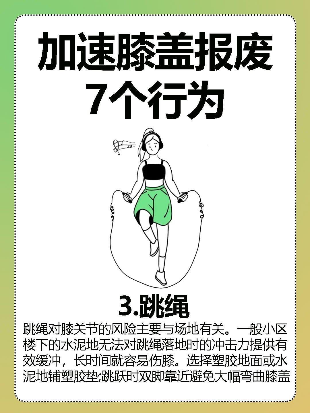 想要膝盖长寿少做这五件事:别让你的膝盖,提前“退休”! “30岁的年纪,60岁的膝盖!” 现在越来越多人被膝盖疼缠上:爬两层楼就腿软阴雨天关节酸胀,运动完疼到睡不着……可你知道吗?膝盖是人体最“娇贵”的关节,软骨磨损不可逆,一旦损伤就无法再生,很多人都是在不知不觉中,把膝盖“用废”的! 这五件伤膝大事,千万别再做了!第一是盲目登山爬楼——下山时膝盖要承受3-5倍体重的冲击力,相当于每走一步都在“硬碰硬”,绍兴姑娘没热身就爬山,直接疼到关节积液,骨科门诊这类患者近期激增30%。第二是频繁蹲跪,下蹲时膝盖负重是体重的8倍,长期跪着擦地、蹲着洗衣,会加速软骨剥脱,最后发展成骨性关节炎。 第三是肥胖不控制,体重每增加10斤,膝盖负担就多30斤,相当于每天背着一袋米走路,软骨磨损速度直接翻倍。第四是膝盖受凉,关节周围血管少,空调直吹、穿露膝装会让血管收缩,血液循环变差,老寒腿就是这么冻出来的。第五是久坐不动,久坐让腿部肌肉萎缩失去对关节的支撑,反而加重膝盖压力难怪办公室白领一到下班就膝盖僵硬。 更扎心的是,很多人以为“多运动才健康”,却踩错了坑:福州小伙跟风跳绳减肥,每天猛跳半小时,结果膝盖疼到扶墙走,确诊髌腱炎;70岁阿姨每天暴走2万步,最后半月板撕裂要手术。其实护膝的核心是“适度”,不是不动,而是选对方式。 医生公认的护膝秘诀很简单:用游泳、骑自行车替代爬山跑步,减少关节冲击;每天做10分钟坐姿抬腿,强化股四头肌这个“天然护膝”;控制体重、注意保暖,避免长时间保持一个姿势。膝盖的寿命,藏在每一个日常选择里,它陪你走了几十年路,可经不起反复折腾。 你有没有膝盖疼的困扰?是不是也踩过登山、深蹲的伤膝坑?欢迎在评论区分享你的护膝经验,说说你最爱的低冲击运动是什么!